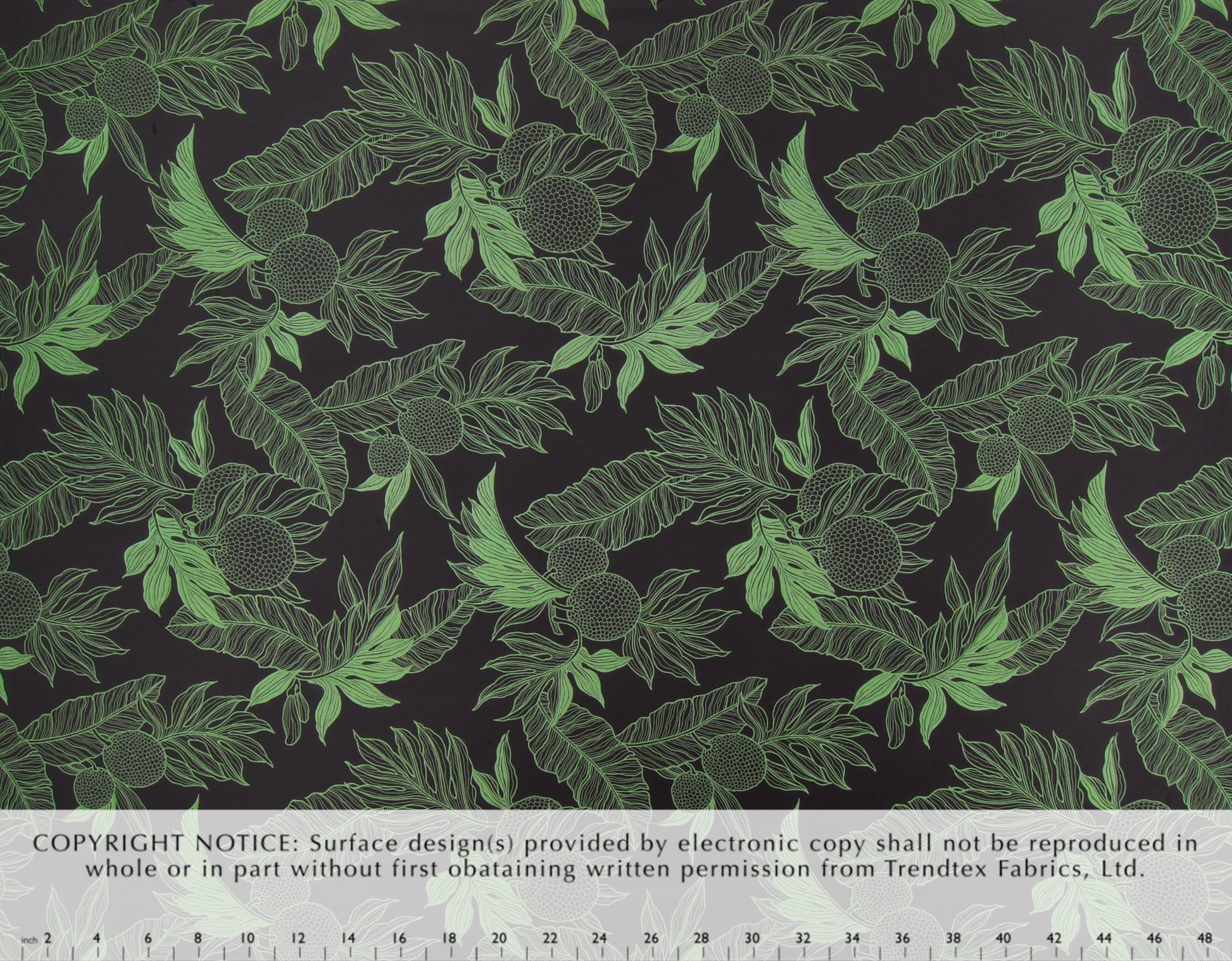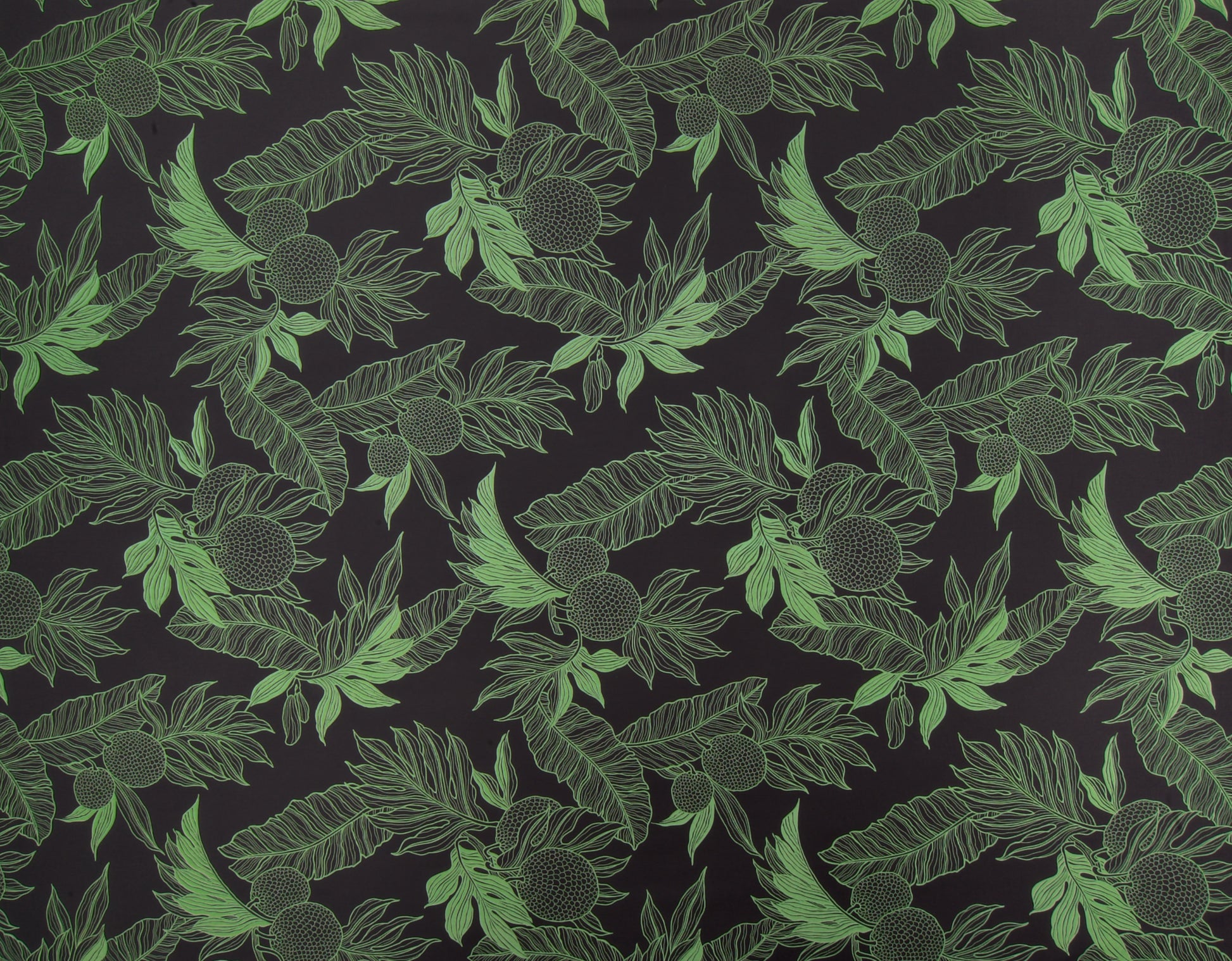 65% Polyester/35% Cotton Poplin, 44/45" Wide, One Way. Linework Ulu (Breadfruit) and Tropical Leaves.