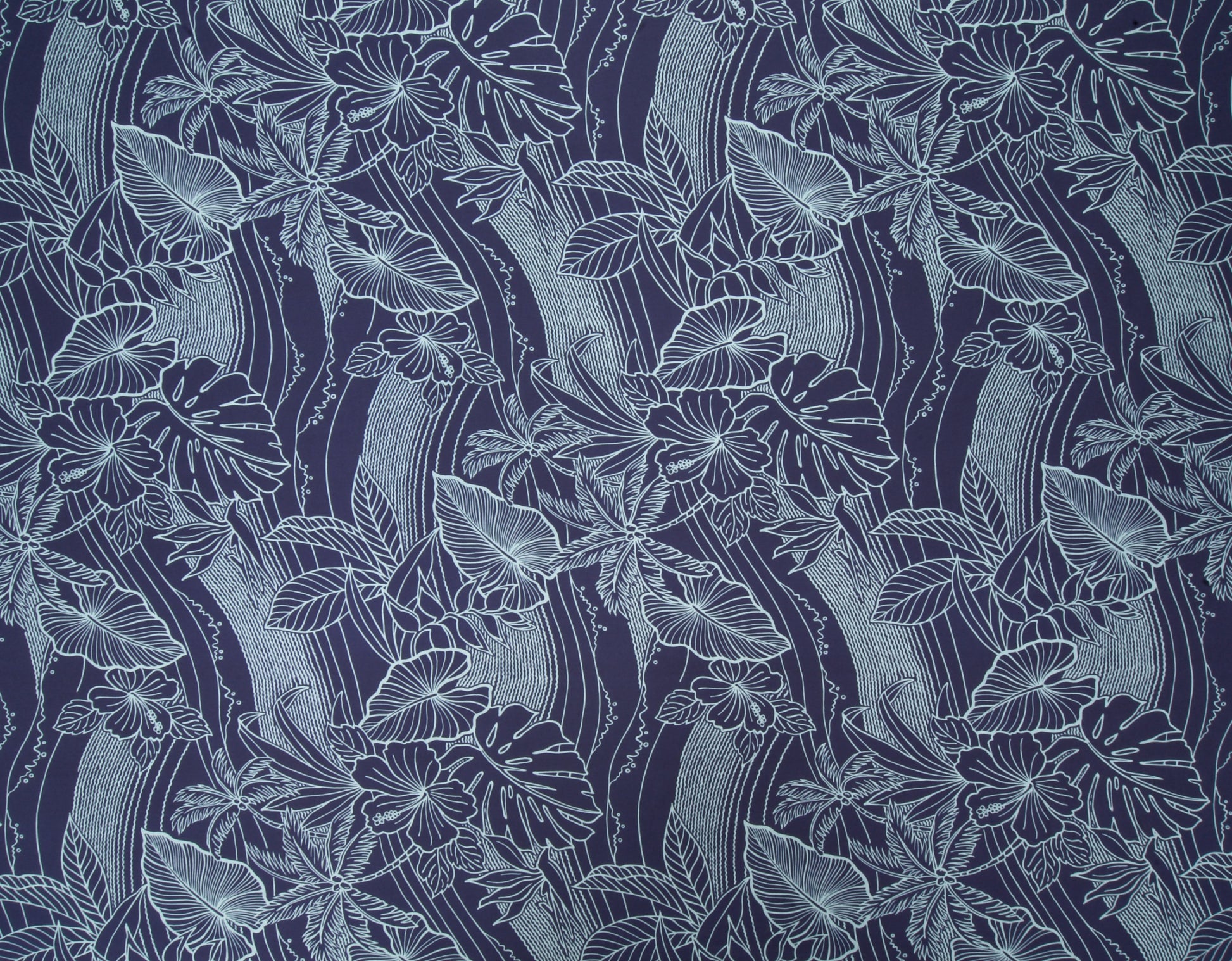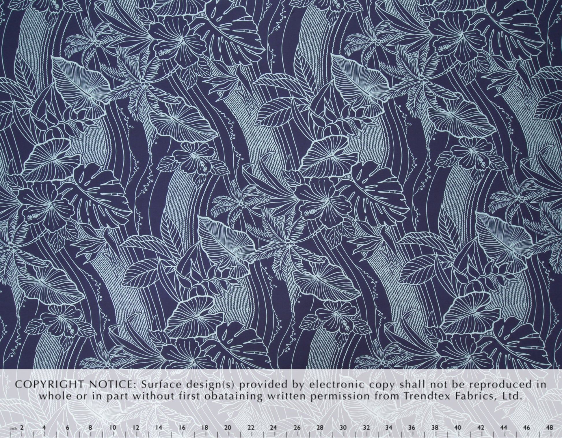 100% Cotton Poplin, 44/45"Wide, One-Way. Stylized Line Technique Beach Scenic with Tropical Flowers, Leaves, and Palm Trees.