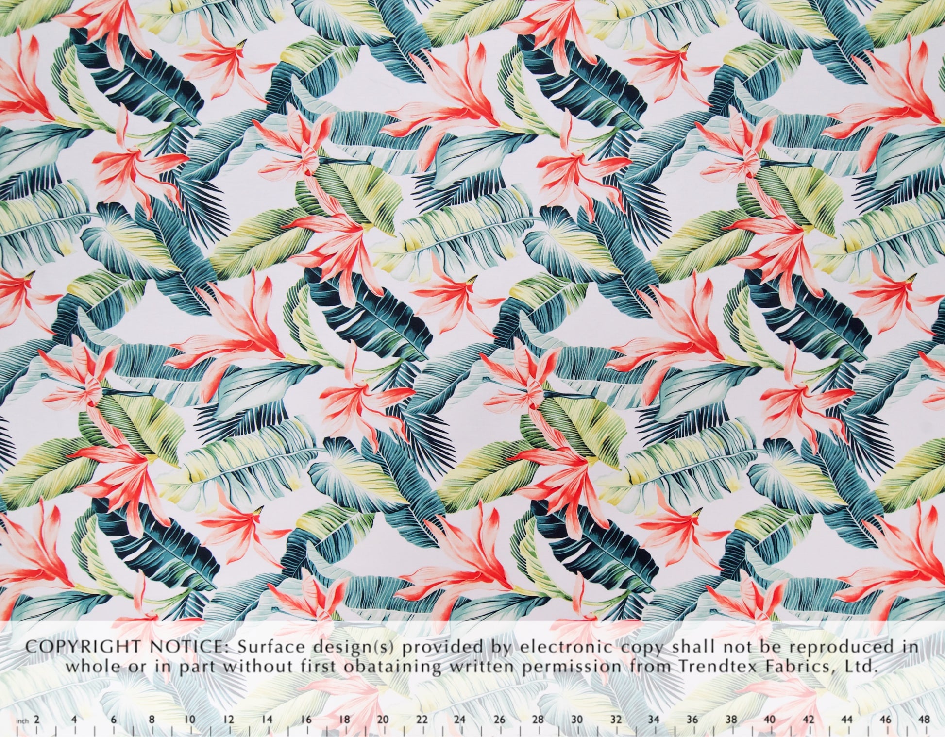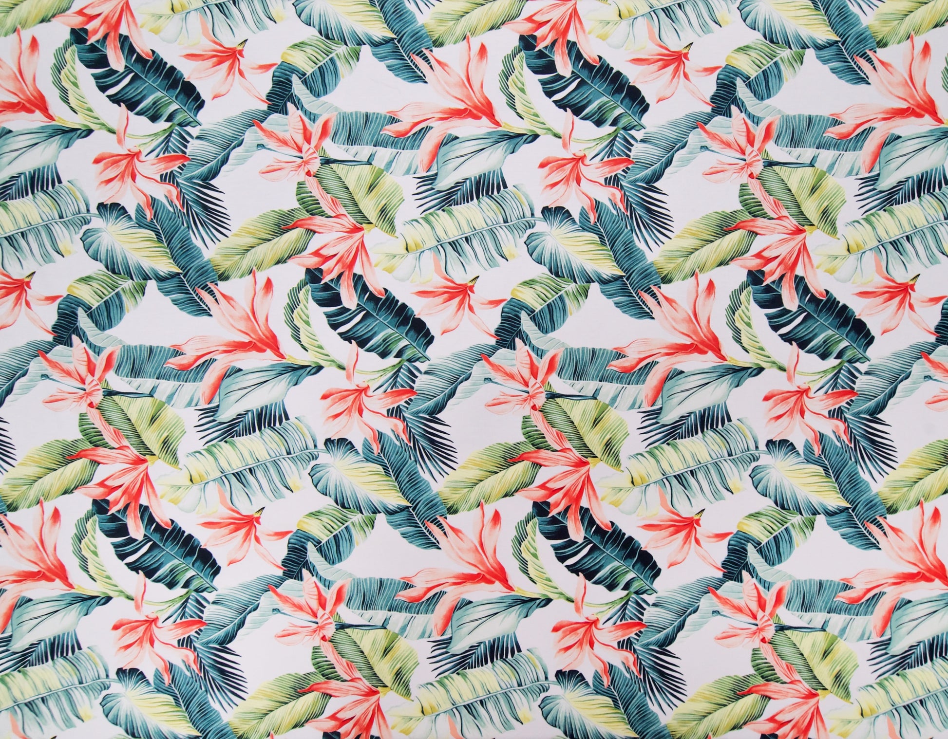 100% Cotton Poplin, 44/45"Wide, All-Over. Realistic Tropical Flowers with Banana and Palm Leaves.
