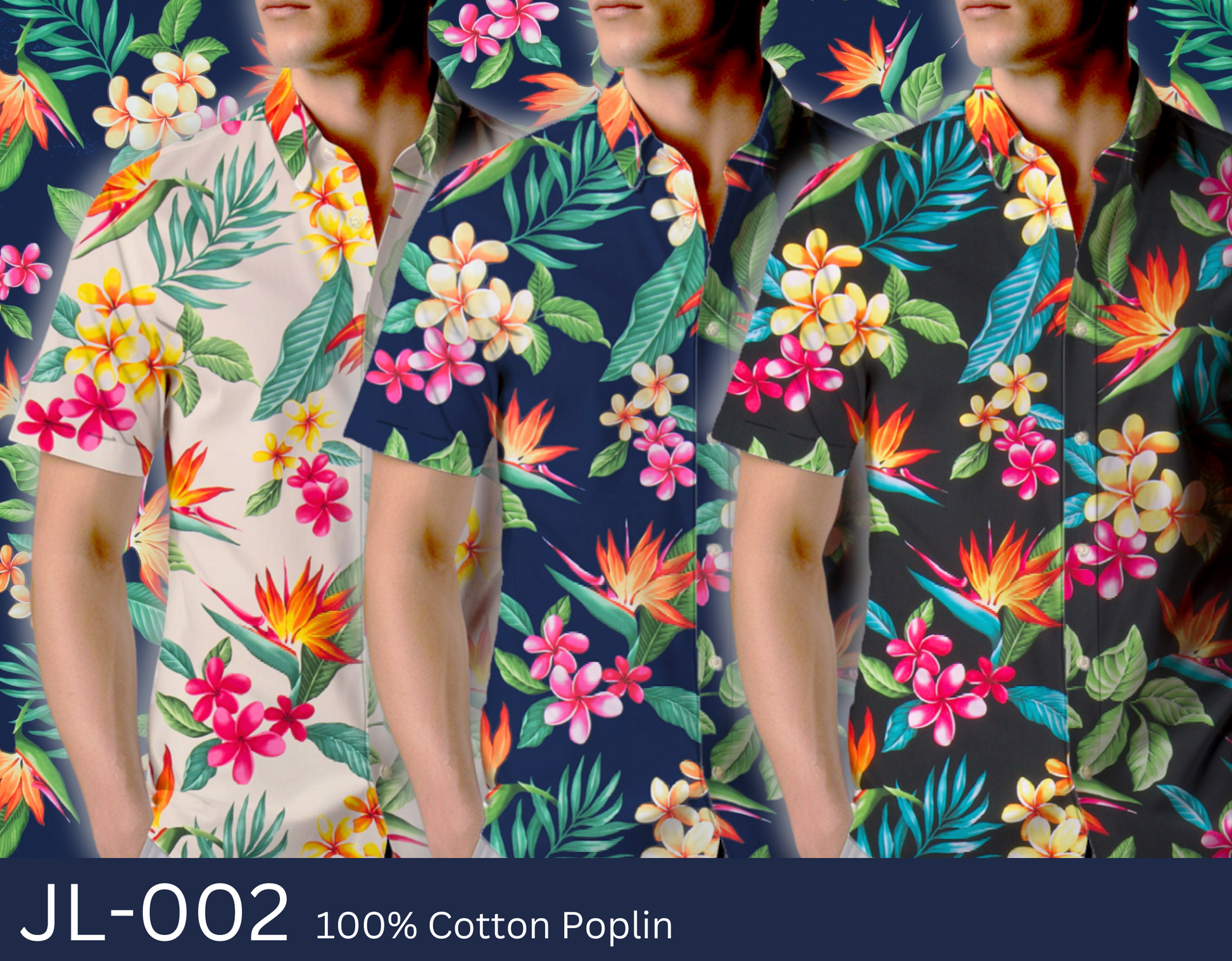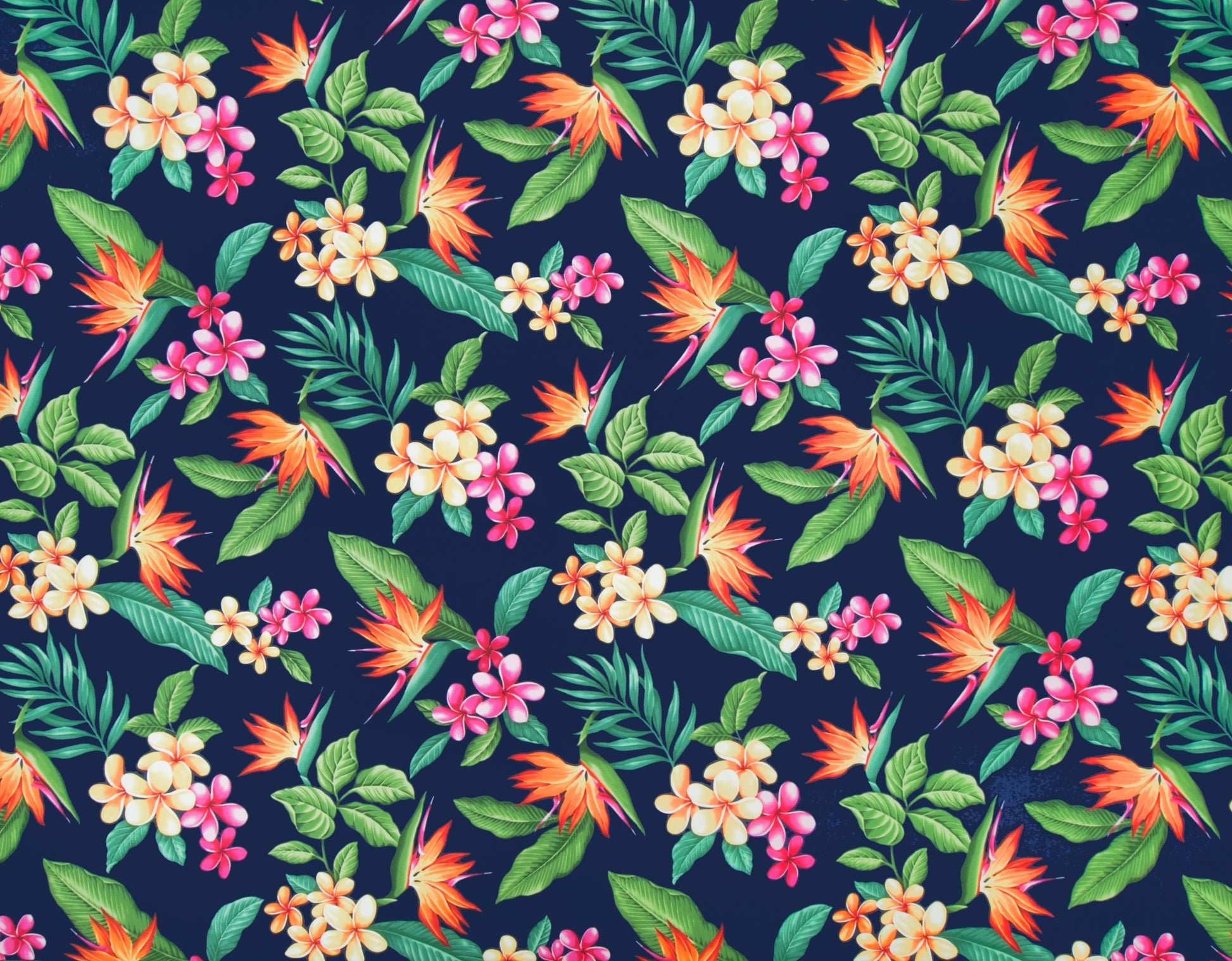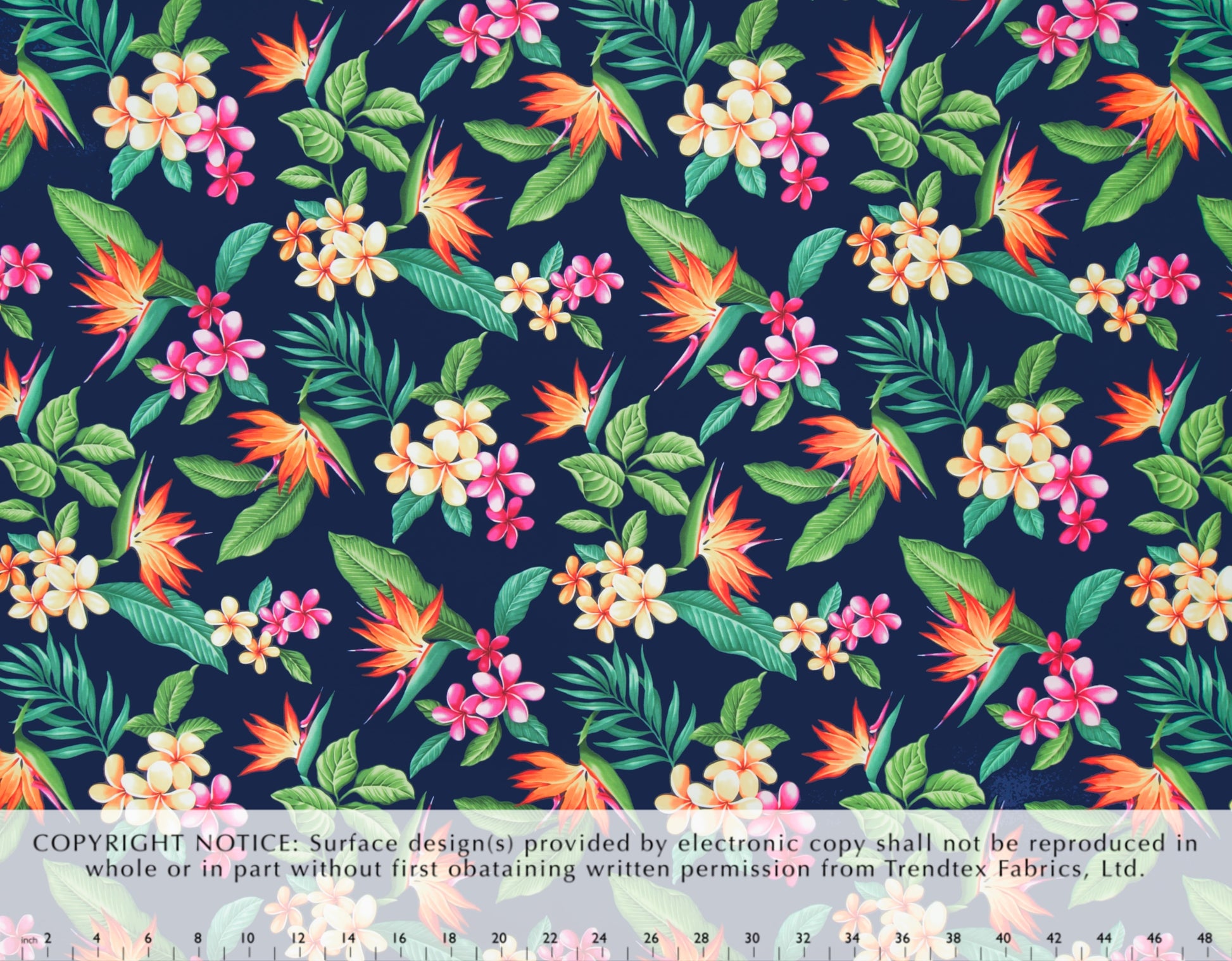 100% Cotton Poplin, 44/45"Wide, All-Over. Airbrushed Bird of Paradise and Plumeria Flowers with Tropical Leaves.