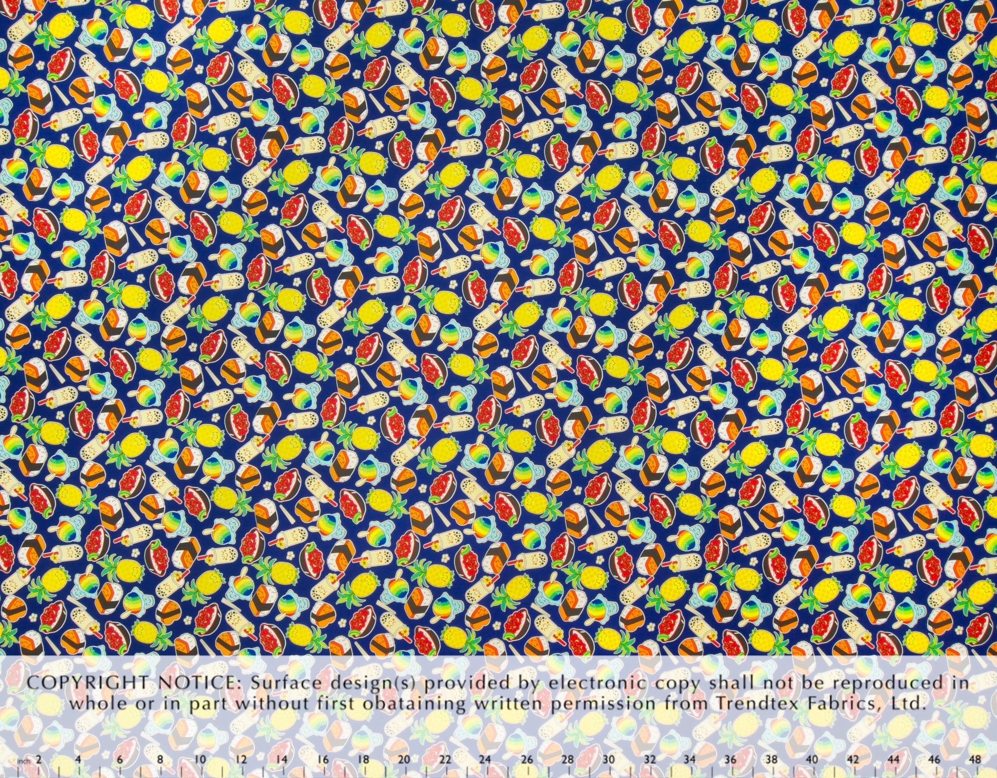 100% Cotton Poplin, 44/45"Wide, All-Over. Cute Animated Kawaii Hawaii Foods, including Musubi, Boba Tea, Poke Bowl, Shave Ice and Pineapple.