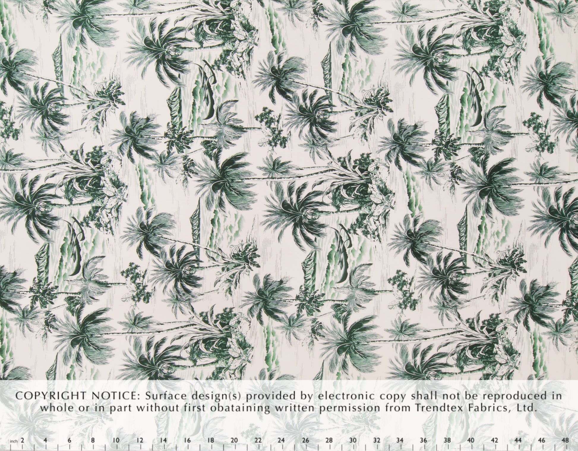 100% Cotton Poplin, 44/45"Wide, One-Way. Sketched Island Scenic with Palm Trees and an Ocean View.