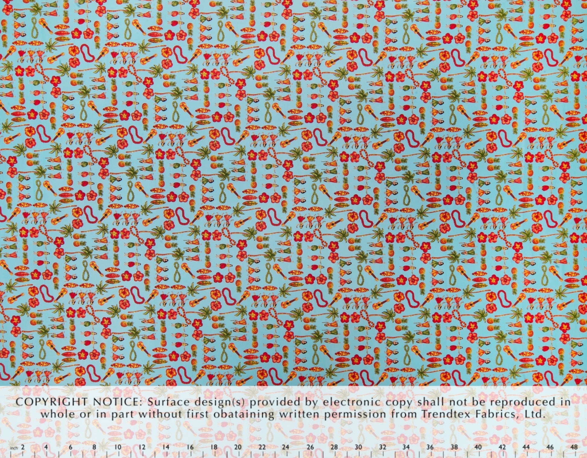 100% Cotton Poplin, 44/45"Wide, All-Over. Conversational Print with Stylized Hula Dancers, Palm Trees, Ukulele, and Surfboards.
