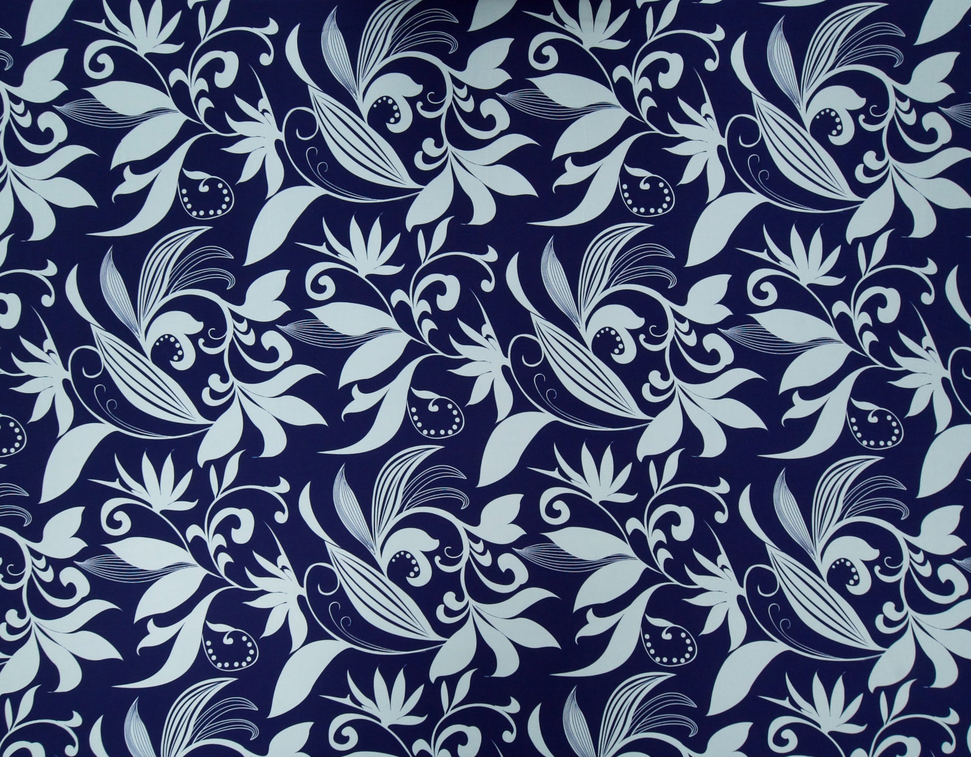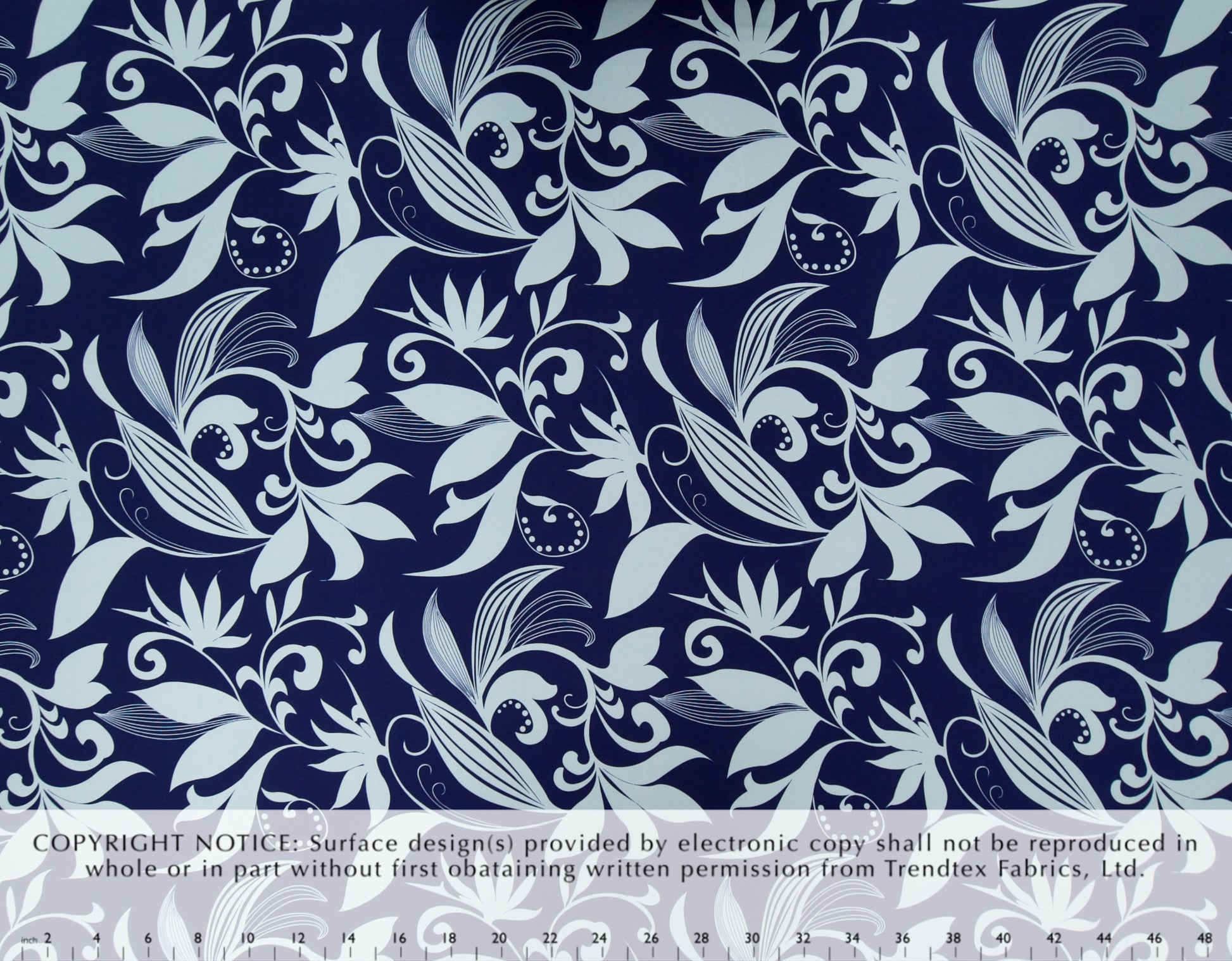 100% Rayon Poplin, 57" Wide, All-Over. Stylized Abstract Tropical Leaves and Bird of Paradise Flowers.