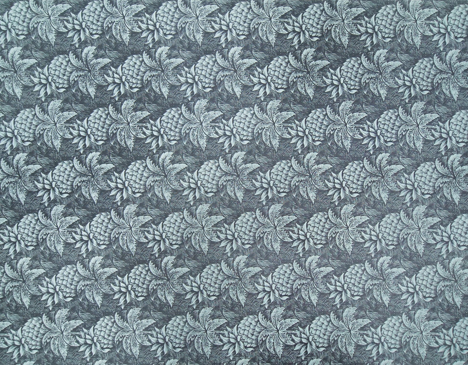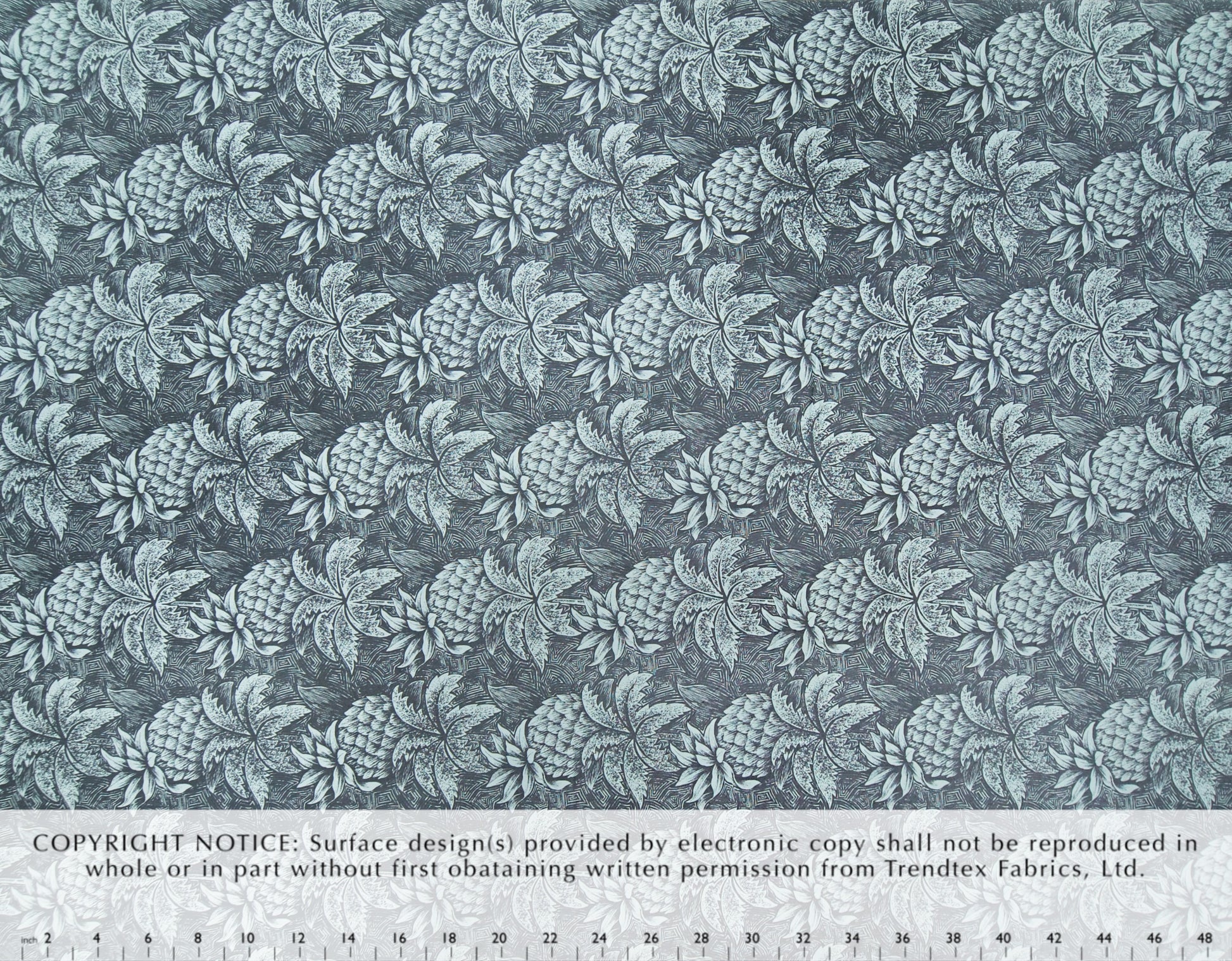 100% Cotton Poplin, 44/45"Wide, One-Way. Etched Pineapples and Palm Trees on a Textured Background.