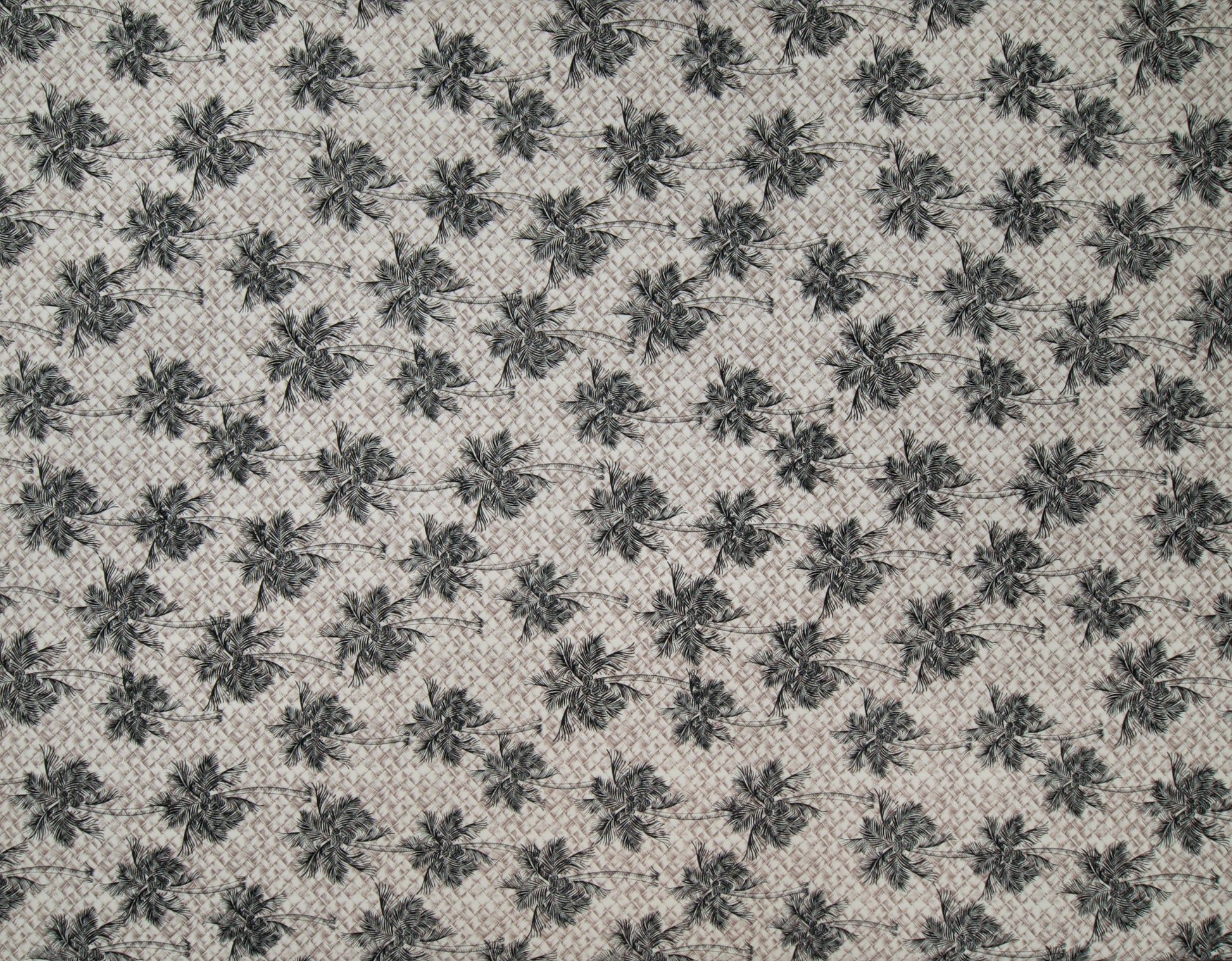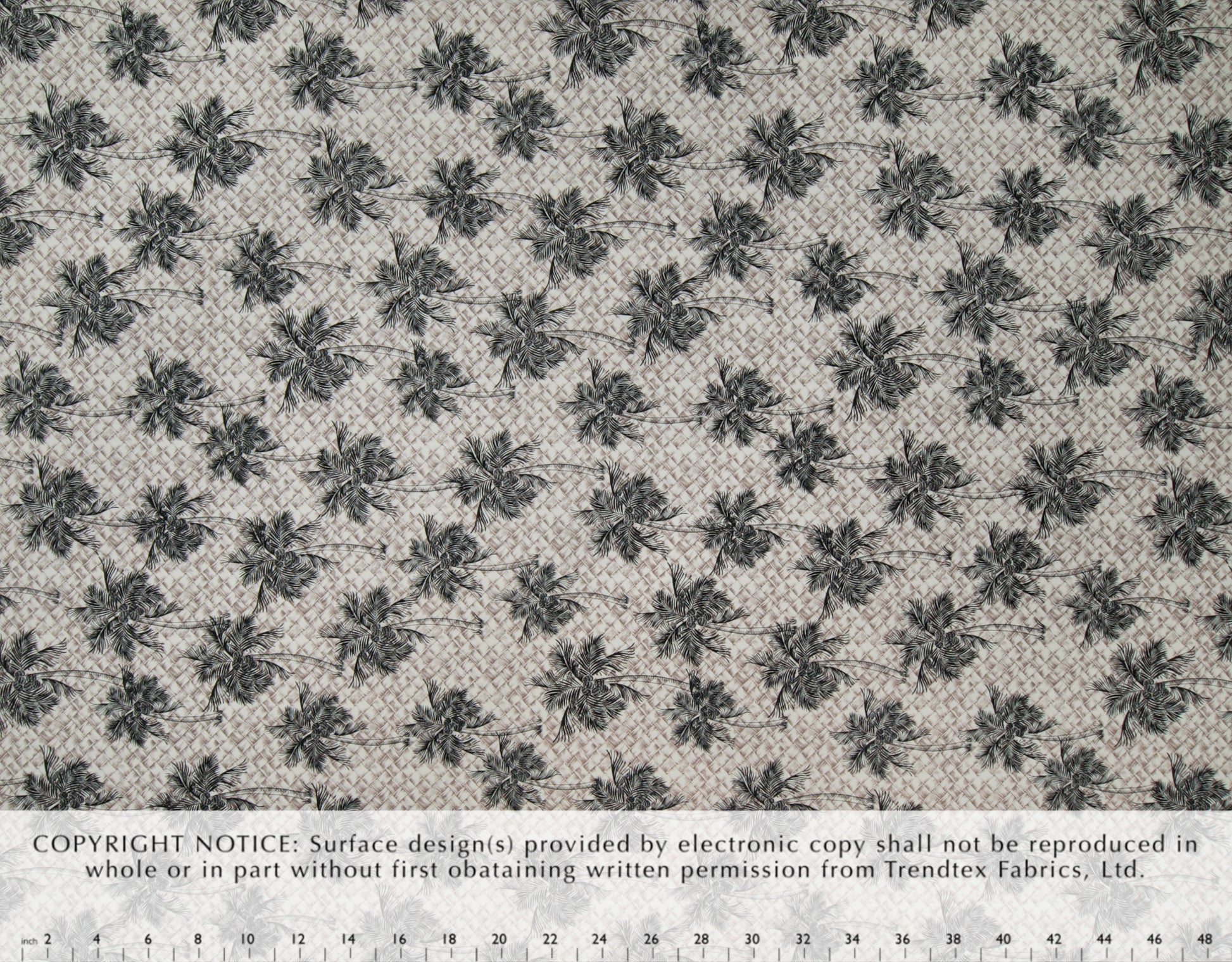 100% Cotton Poplin, 44/45"Wide, One-Way. Stylized Palm Trees on a Woven Lauhala Background.