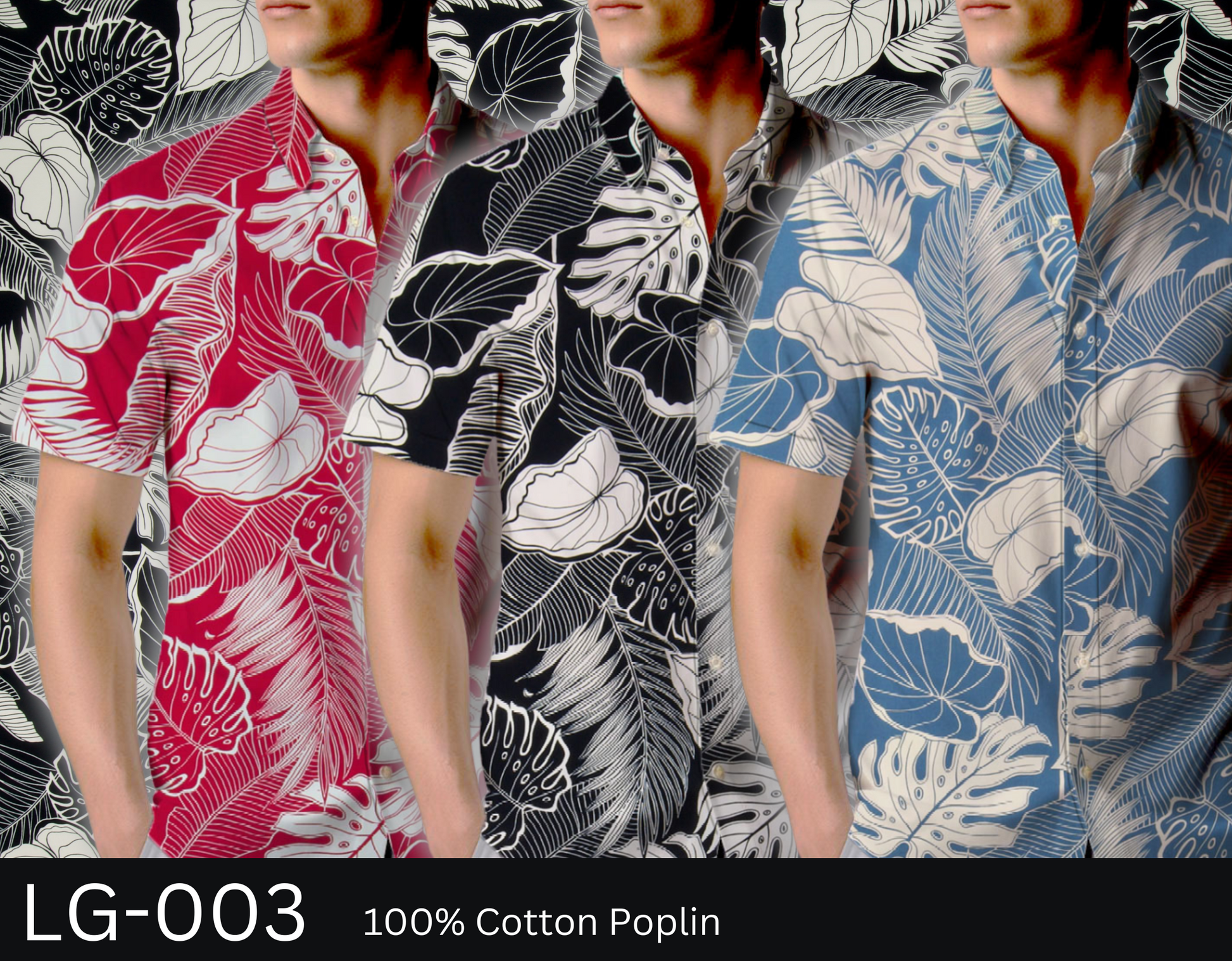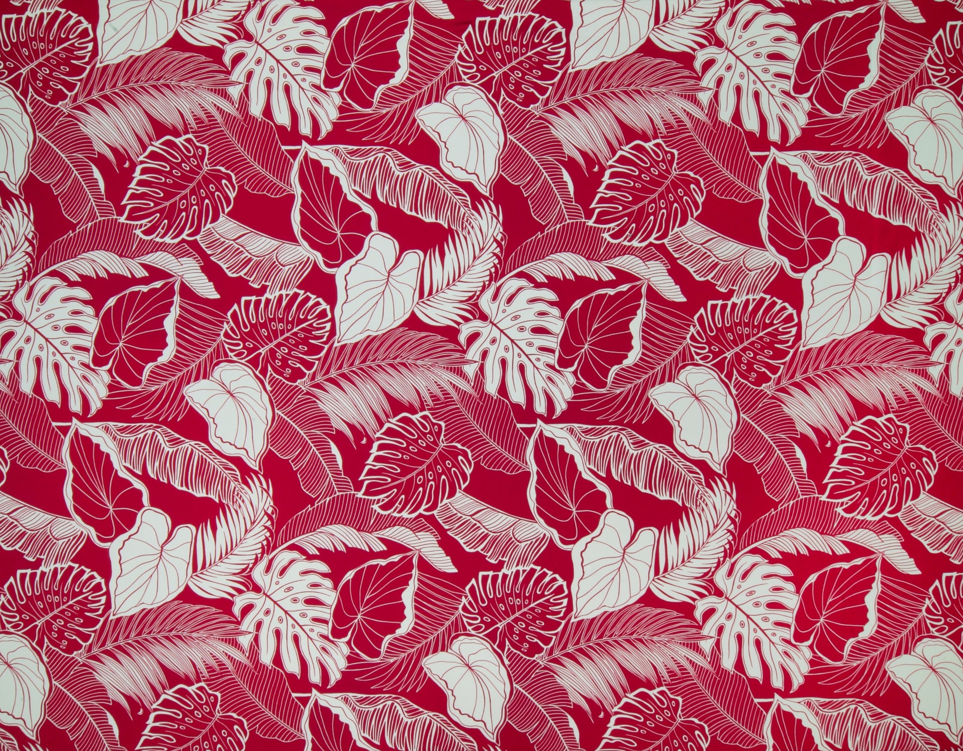100% Cotton Poplin, 44/45"Wide, All-Over. A Variety of Stylized Tropical Monstera, Taro, and Palm Leaves.