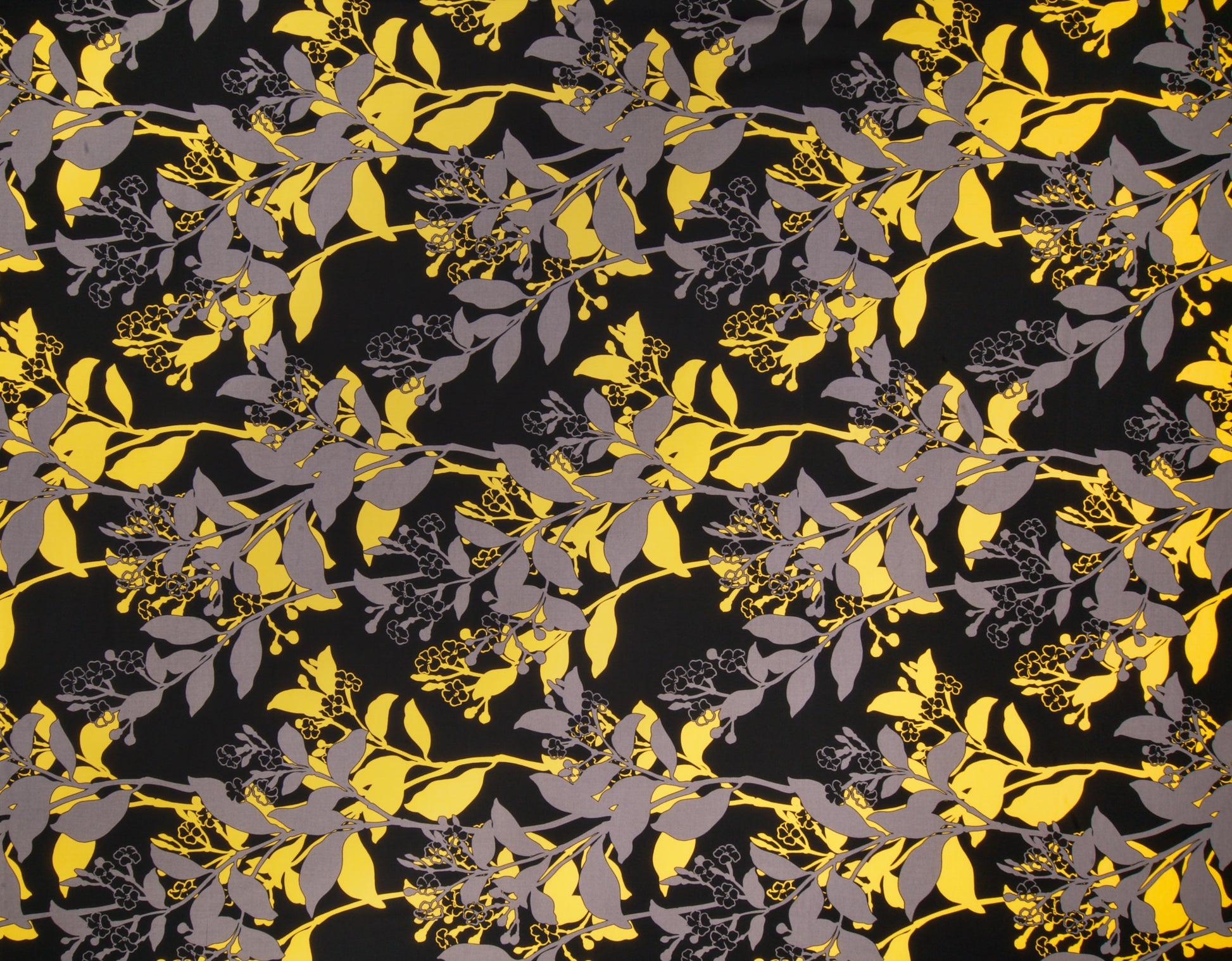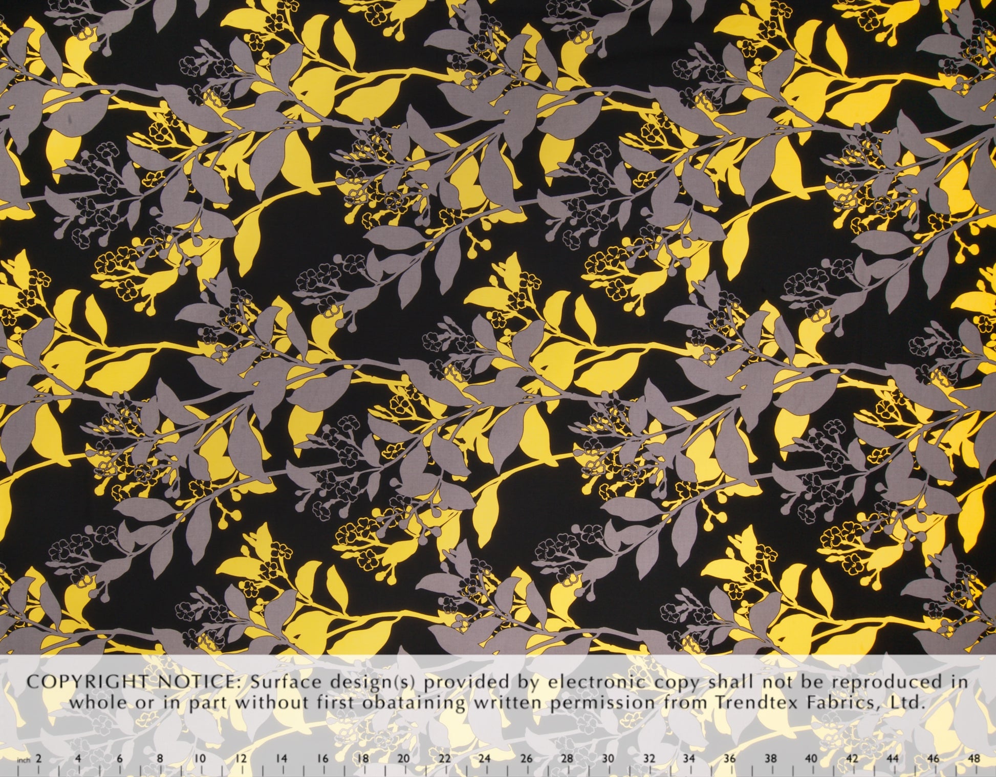 100% Cotton Poplin, 44/45"Wide, One-Way. Branches of Stylized Tropical Puakenikeni Flowers.
