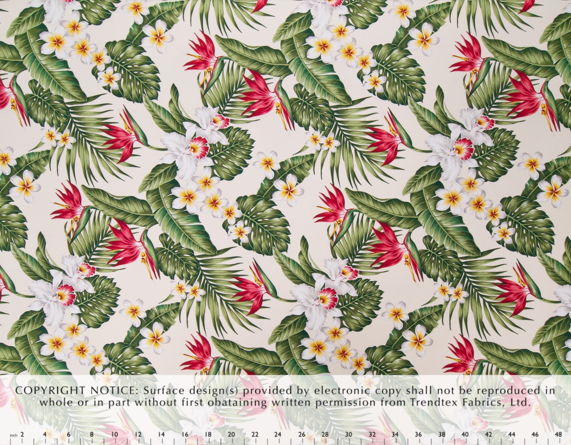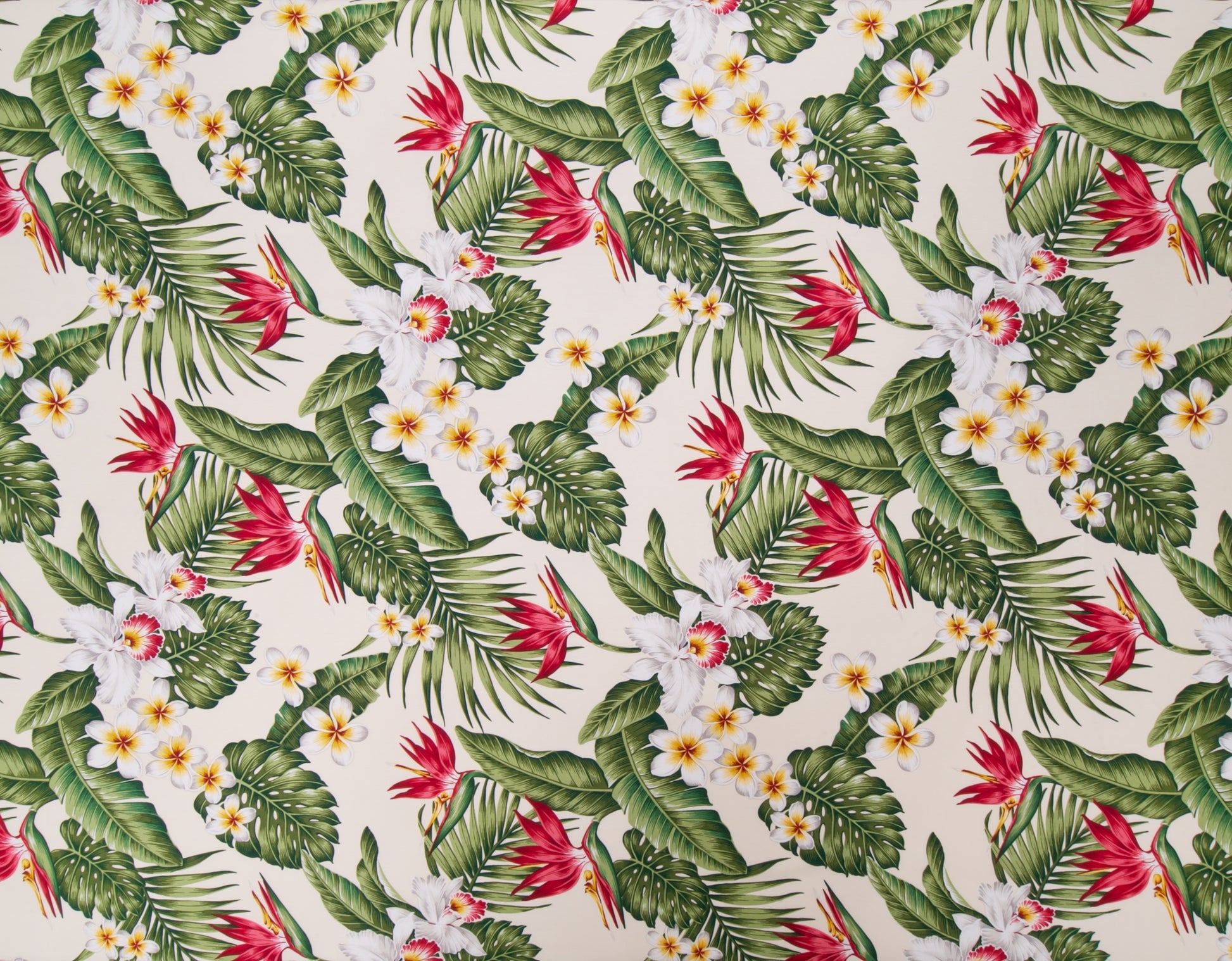 100% Cotton Poplin, 44/45"Wide, One Way. Realistic Tropical Bird of Paradise, Orchid, and Plumeria Flowers Clustered with Monstera and Banana Leaves.