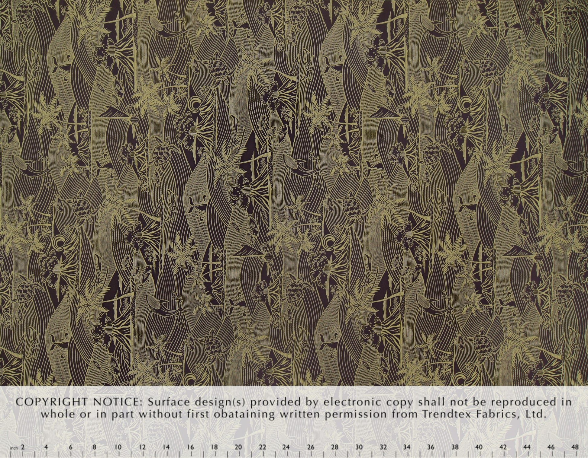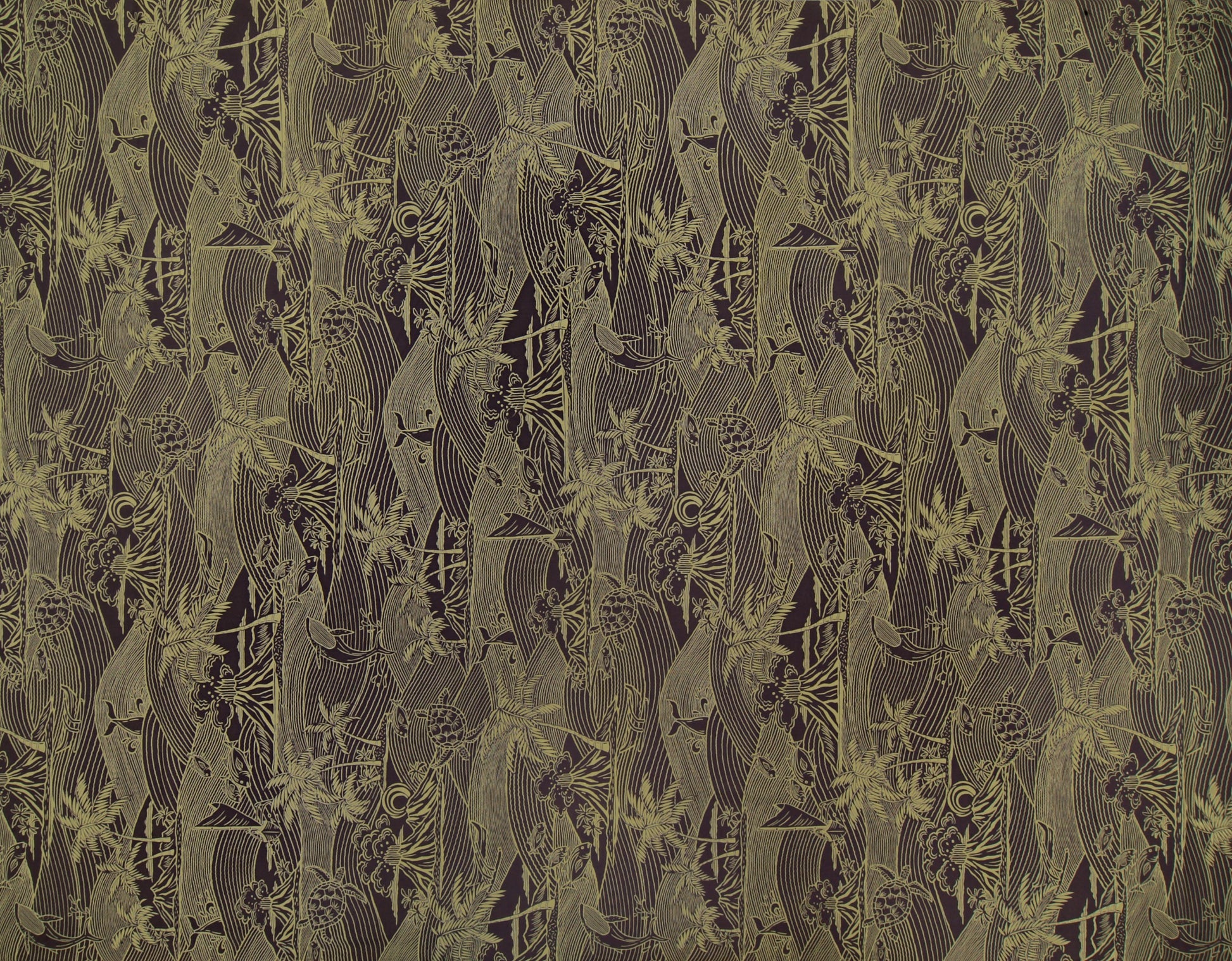 100% Cotton Poplin, 44/45"Wide, One-Way. Stylized Scenic with Beach Scene, Ocean, Whale, Turtles, and Voyaging Canoe.