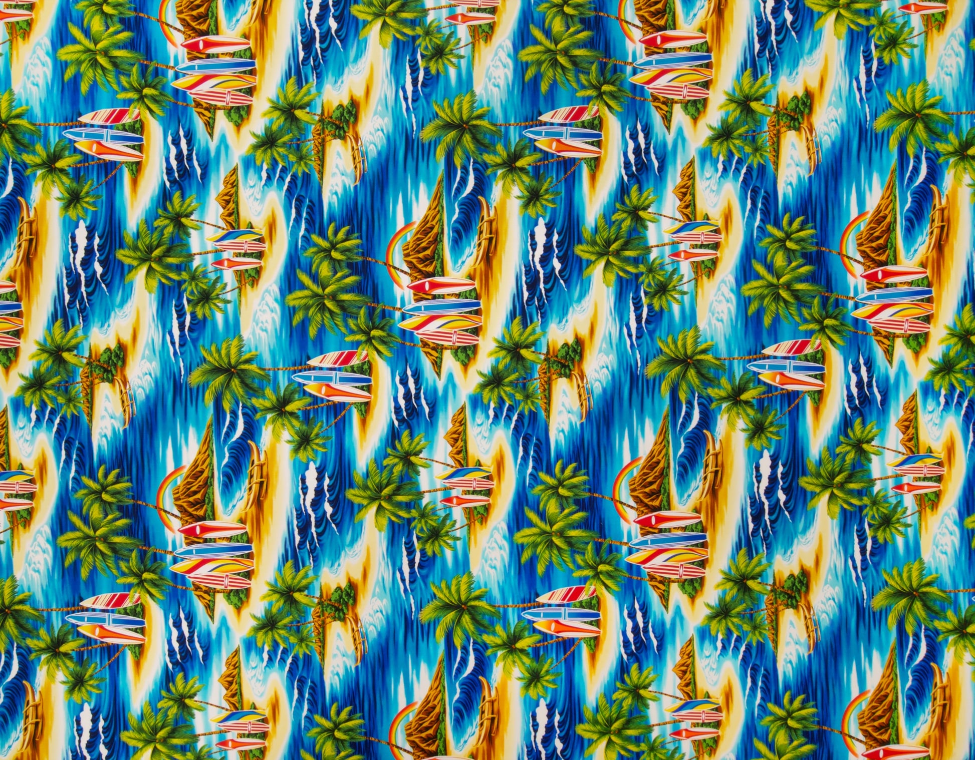 100% Cotton Poplin, 44/45"Wide, One Way. Stylized Island Beach Scenic with Palm Trees, Surfboards, Rainbow, and Mountain.