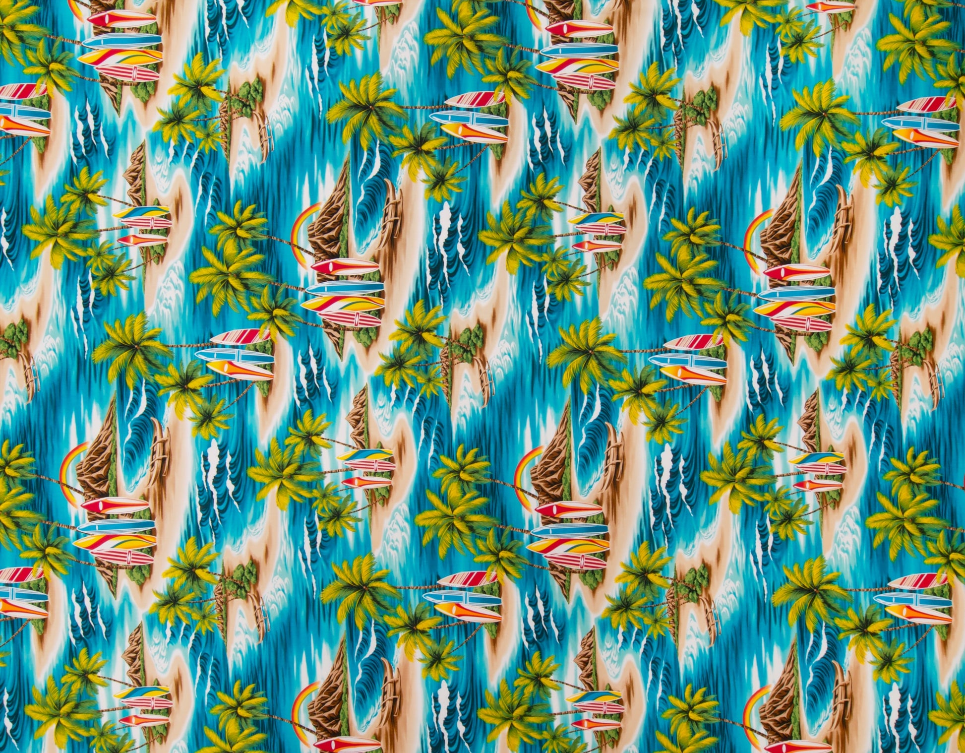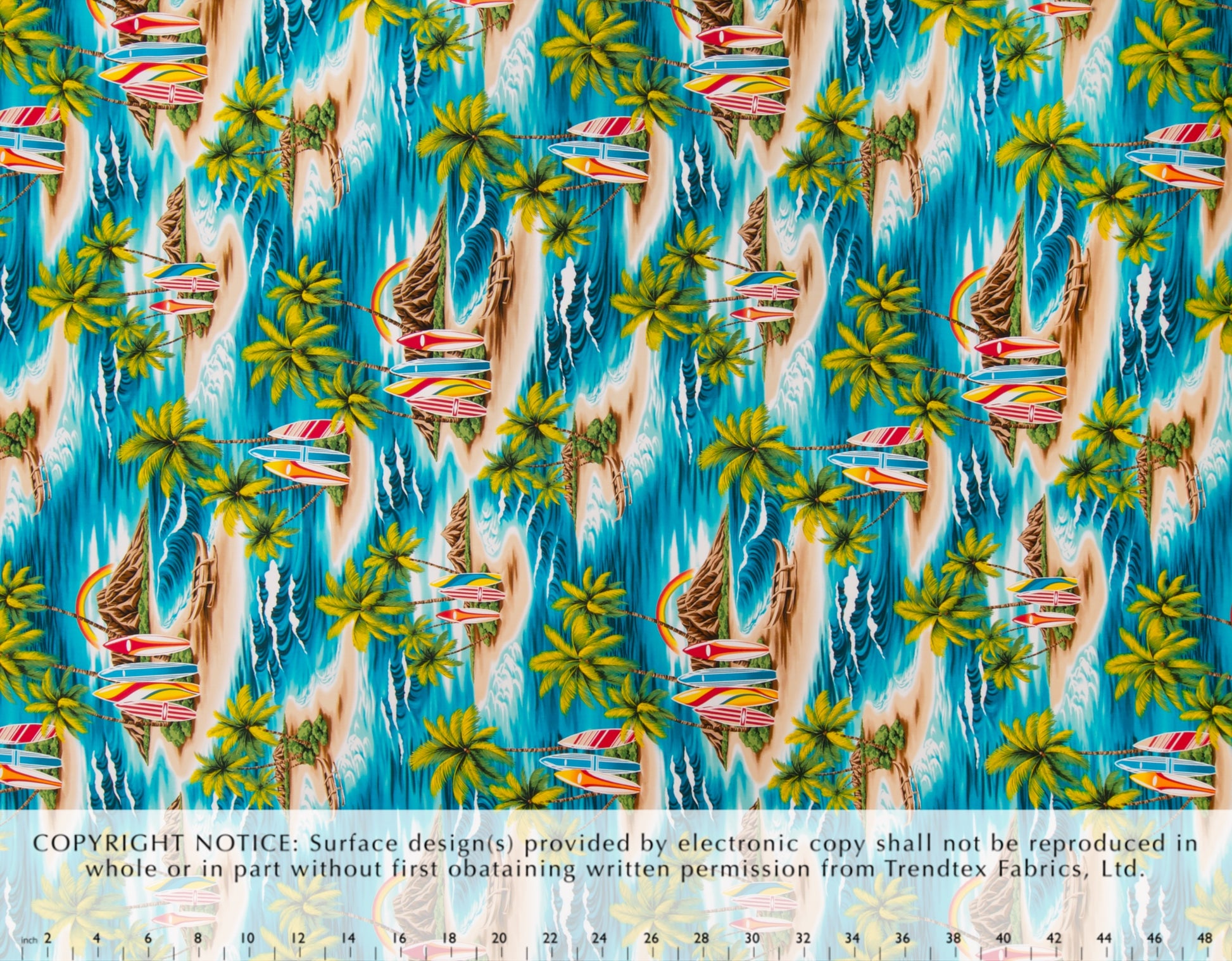 100% Cotton Poplin, 44/45"Wide, One Way. Stylized Island Beach Scenic with Palm Trees, Surfboards, Rainbow, and Mountain.