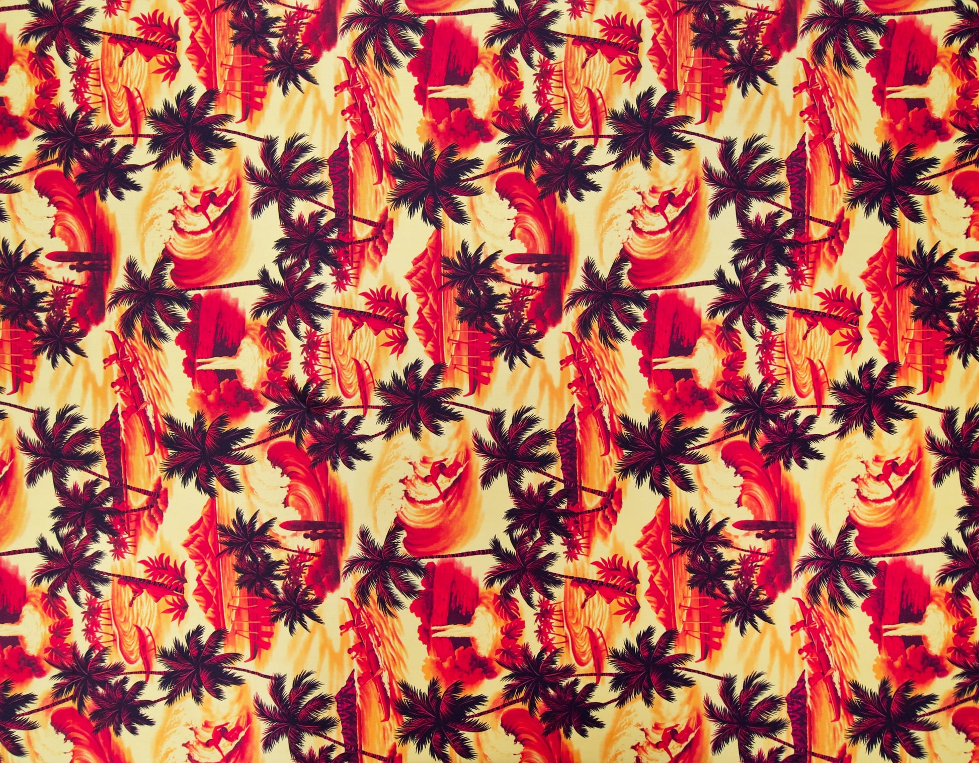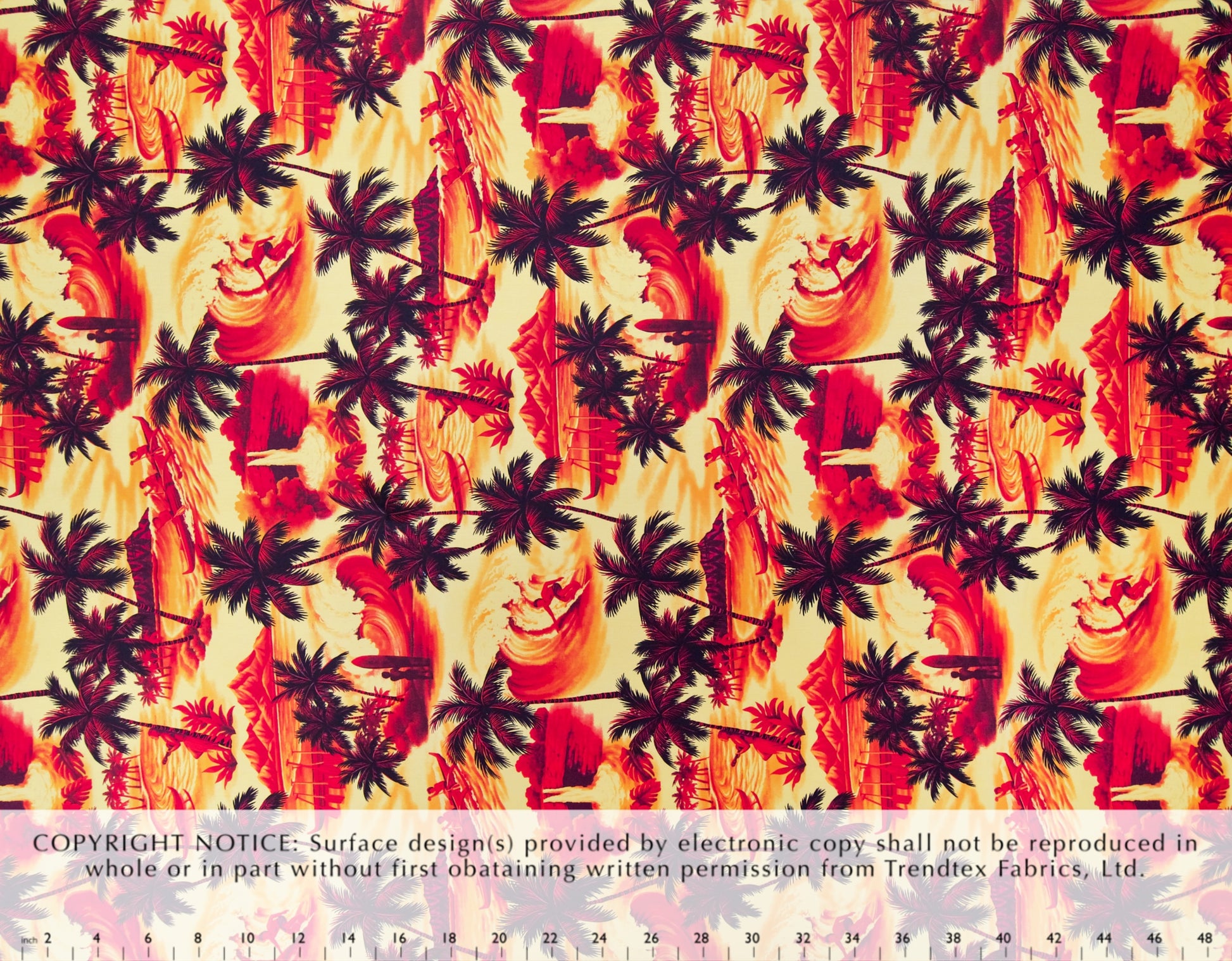 100% Cotton Poplin, 44/45"Wide, One-Way. Island Beach Scenic with Surfers, Palm Trees, Canoes, and Ocean Waves.