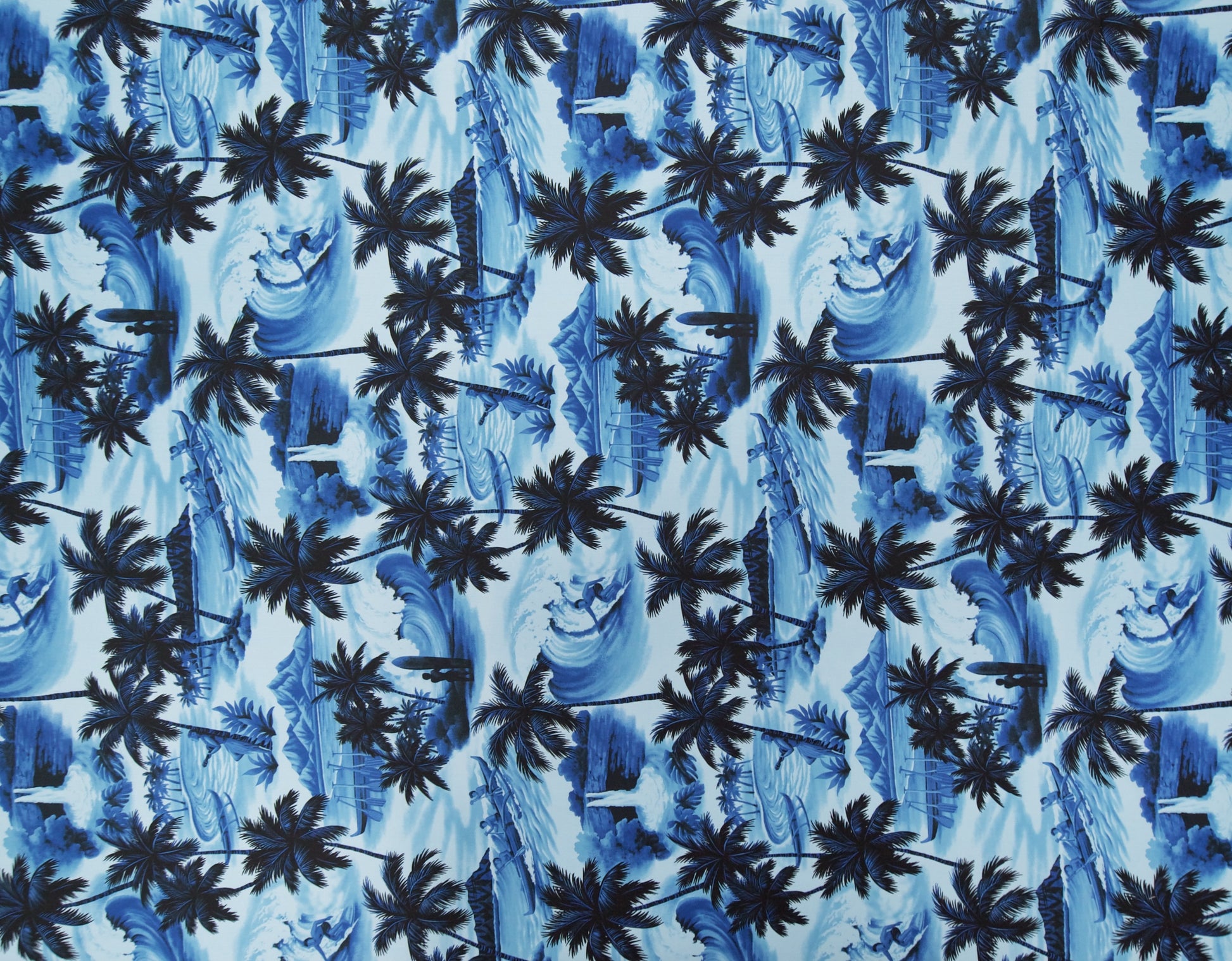 100% Cotton Poplin, 44/45"Wide, One-Way. Island Beach Scenic with Surfers, Palm Trees, Canoes, and Ocean Waves.