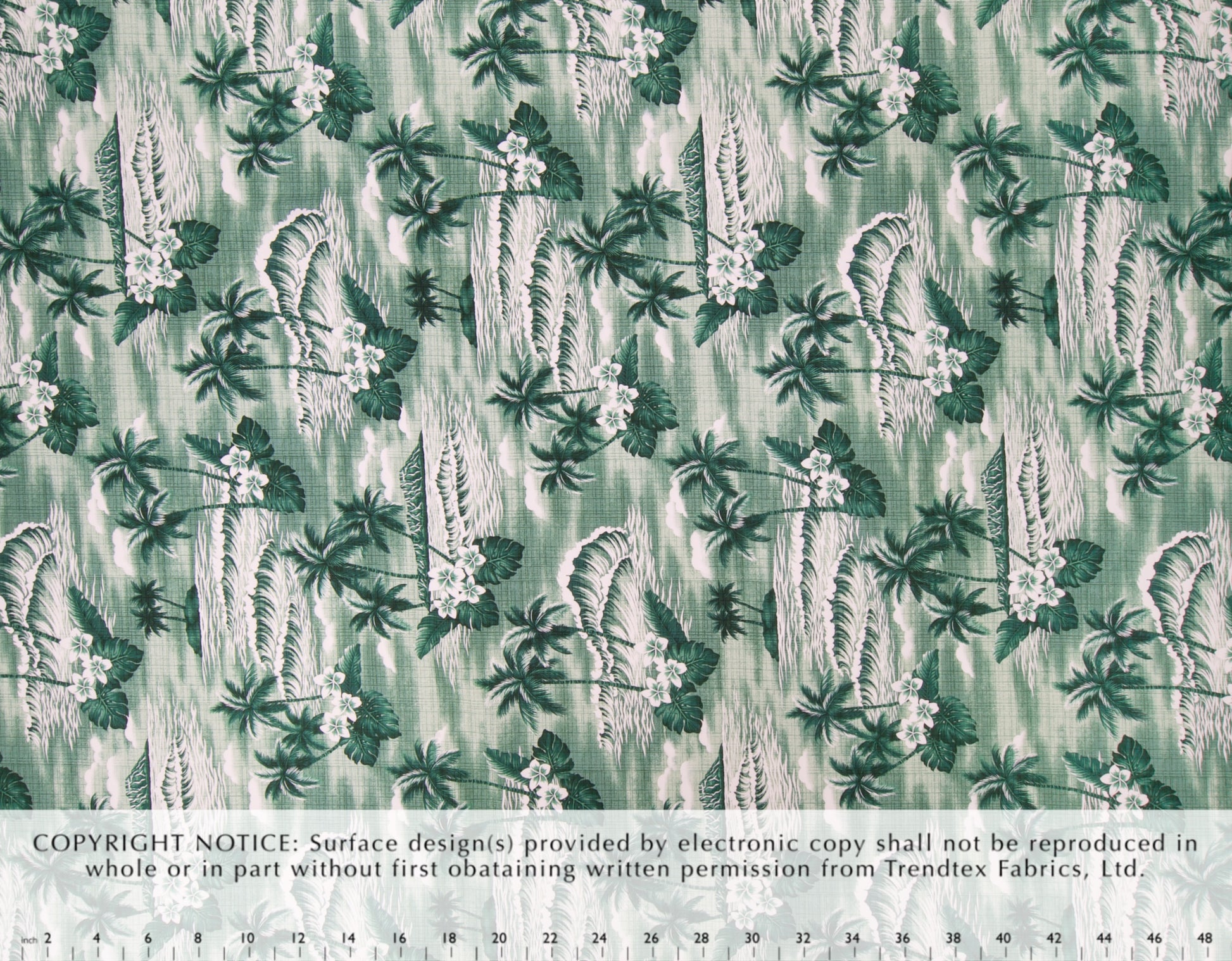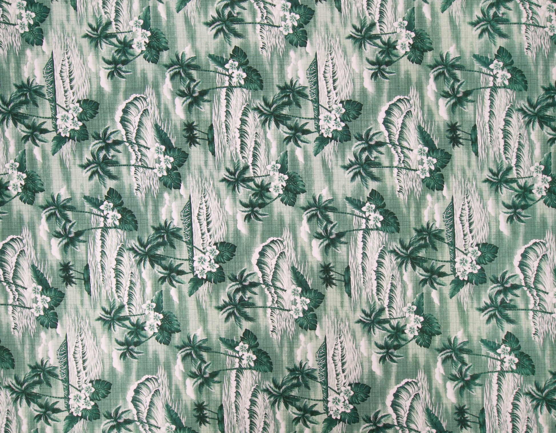 100% Cotton Poplin, 44/45"Wide, One-Way. Textured Tonal Beach Scenic with Palm Trees, Plumeria Flowers and Diamond Head Crater.
