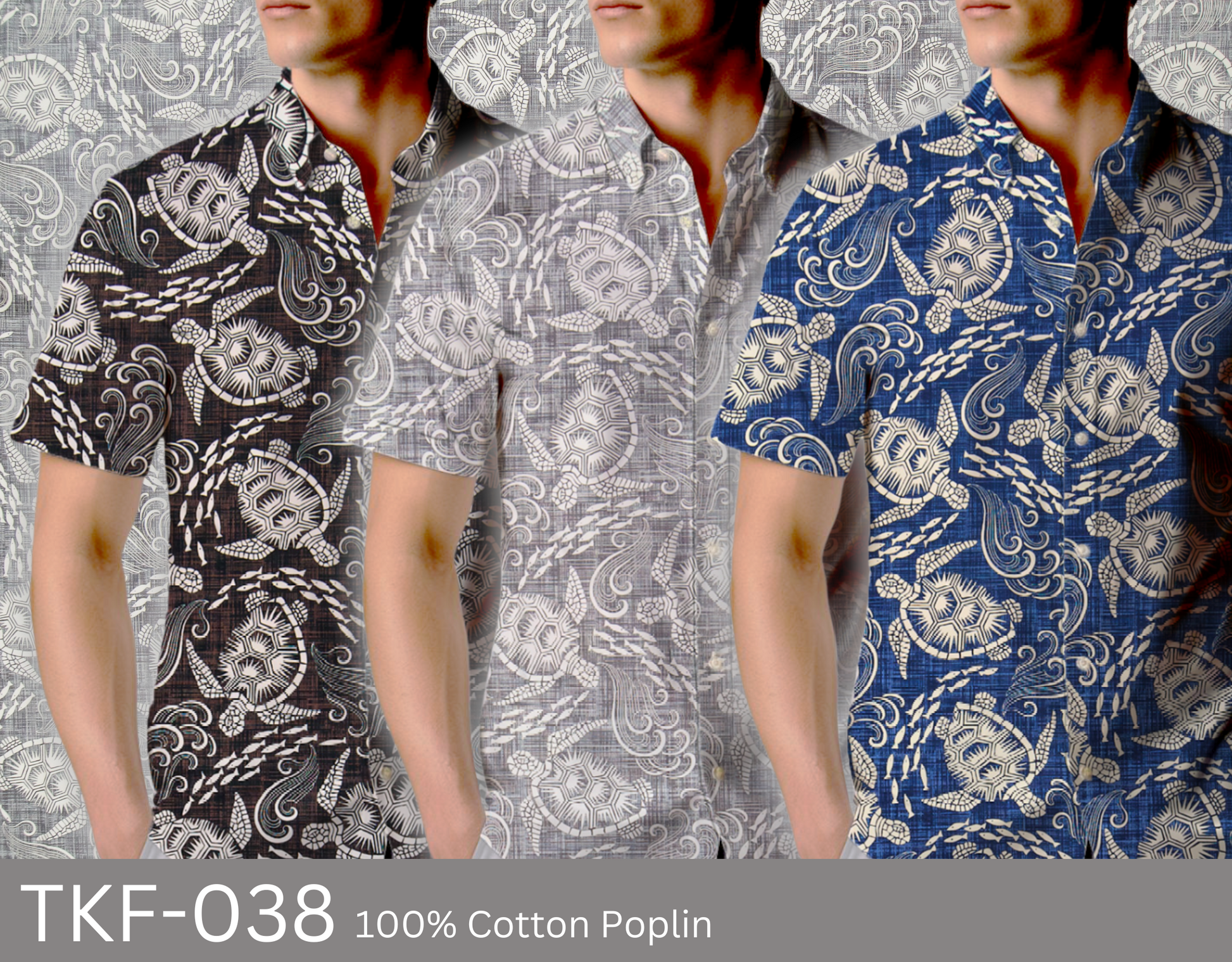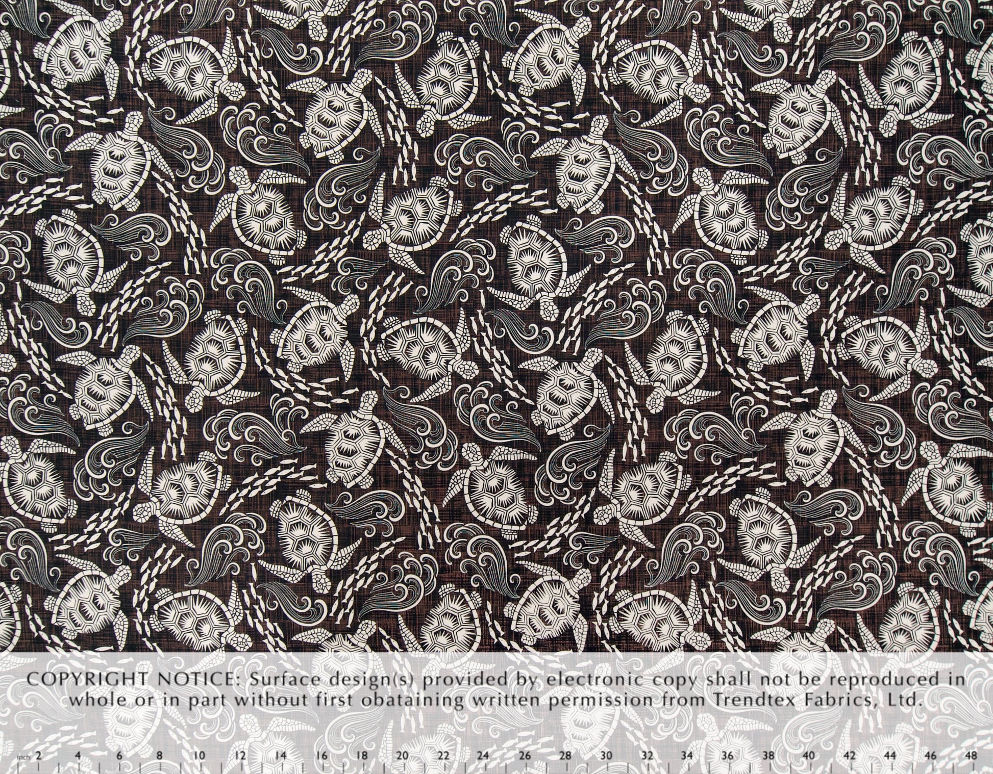 100% Cotton Poplin, 44/45"Wide, All-Over. Abstract Honus (Sea Turtles) and Schools of Fish Swimming Through Waves on a Textured Background.