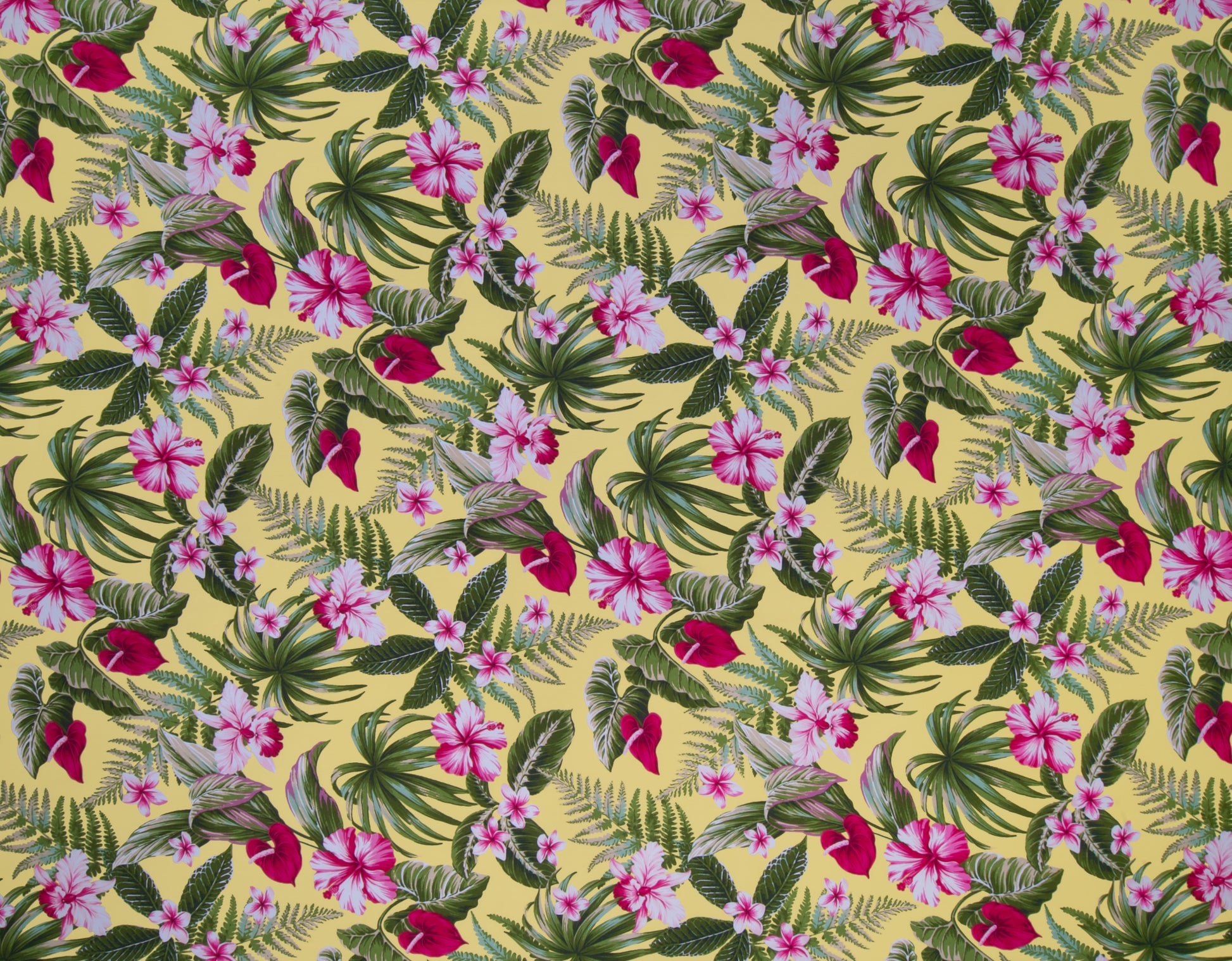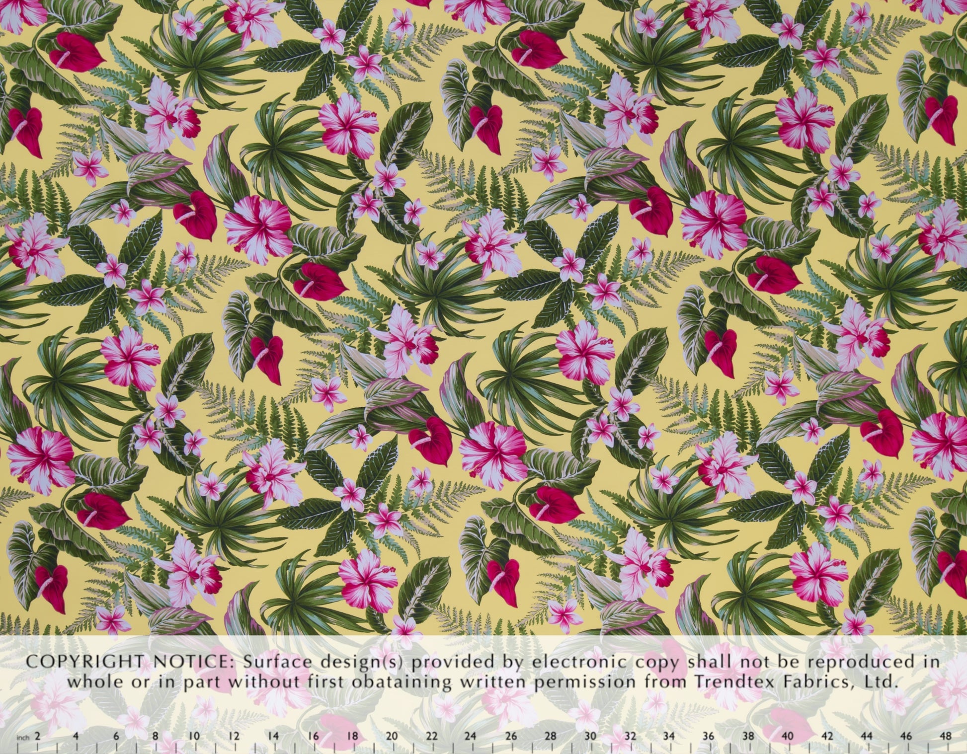 100% Cotton Poplin, 44/45"Wide, All-Over. Realistic Tropical Flowers (Hibiscus, Orchids, Plumeria, and Anthuriums) with a Variety of Tropical Leaves.