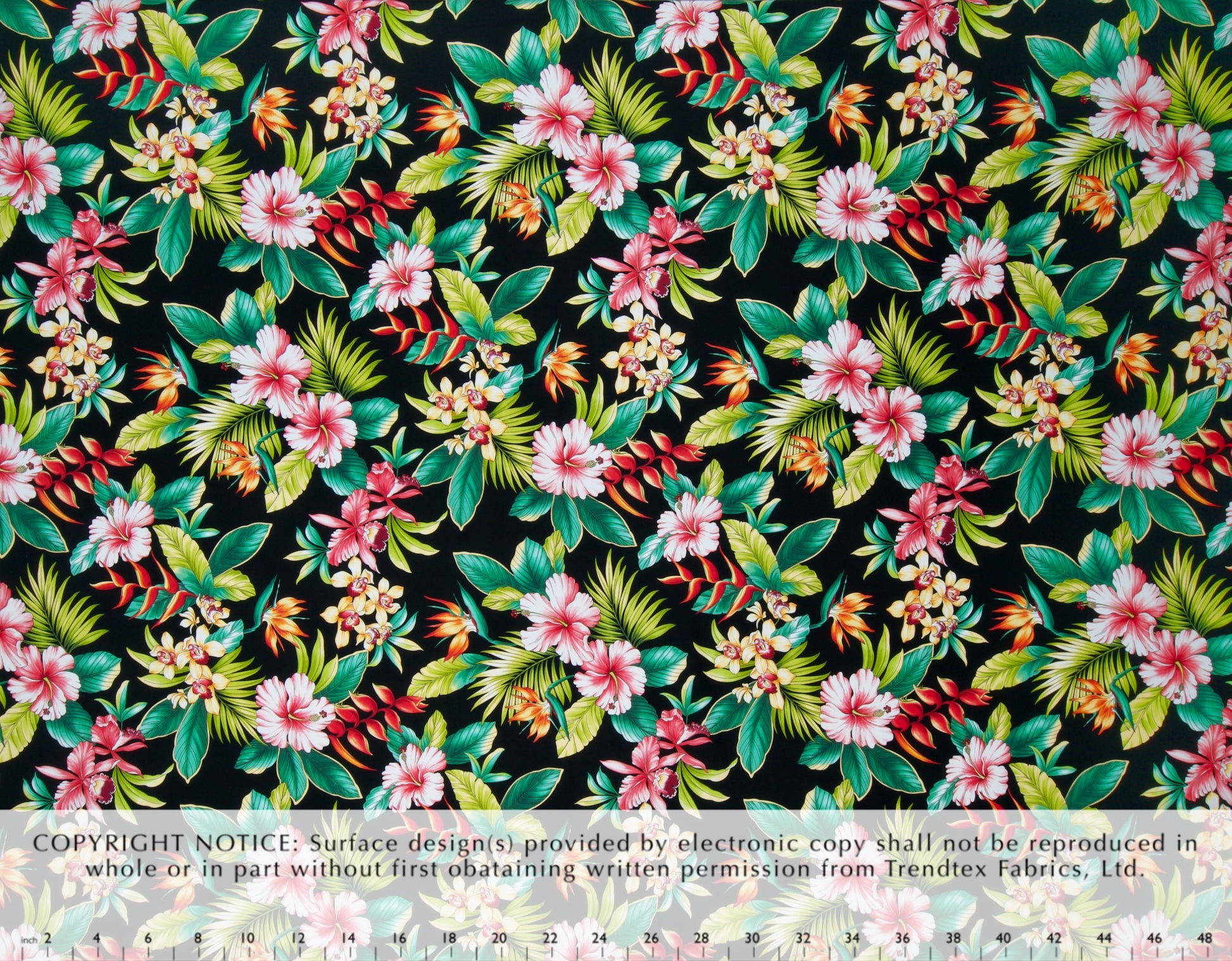 100% Cotton Poplin, 44/45"Wide, All-Over. Stylized Tropical Orchids, Hibiscus, Bird of Paradise and Heliconia Flowers.