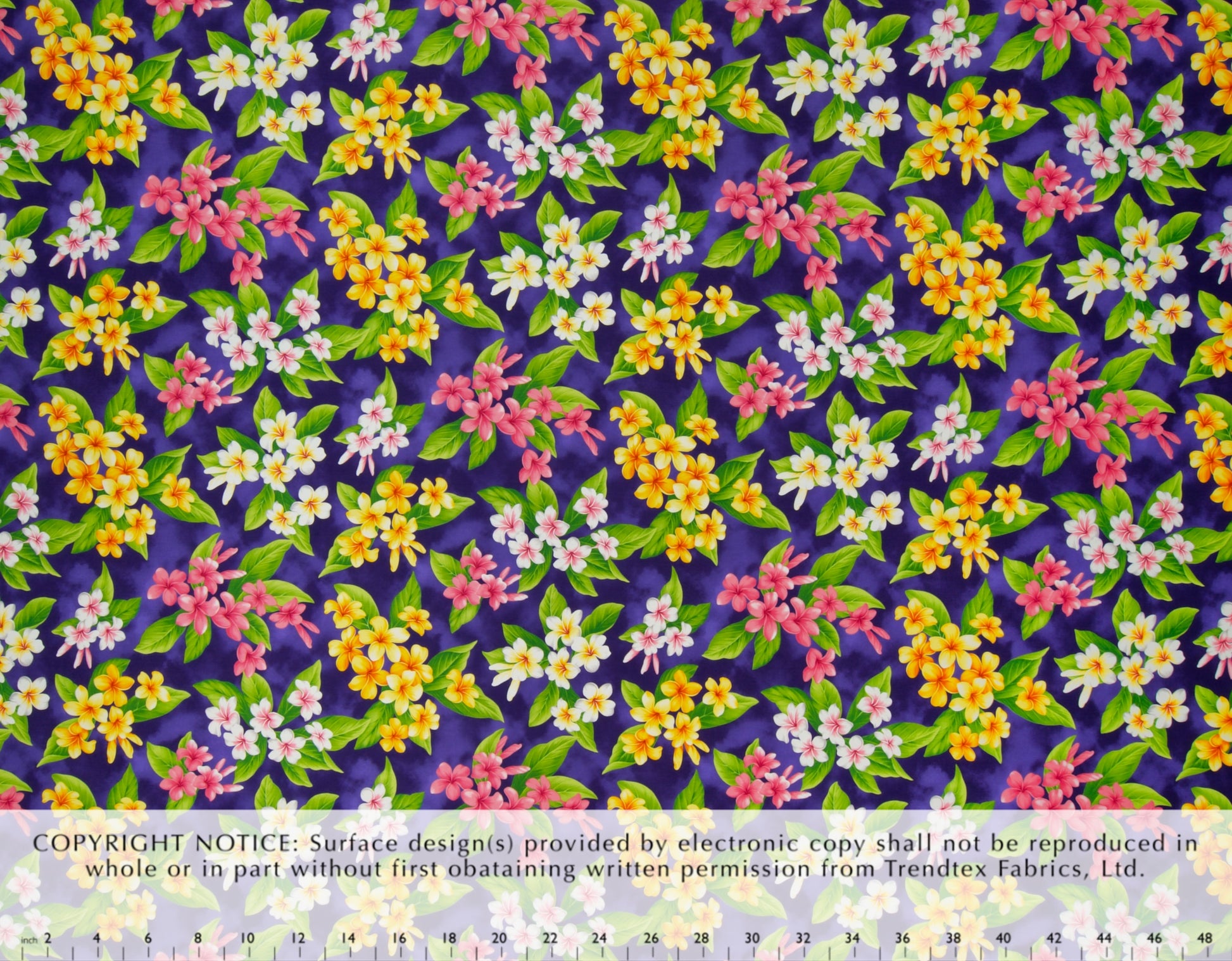 100% Cotton Poplin, 44/45"Wide, All-Over. Floral Pattern with Tropical Multi-Colored Plumeria Flowers on an Airbrushed Background.