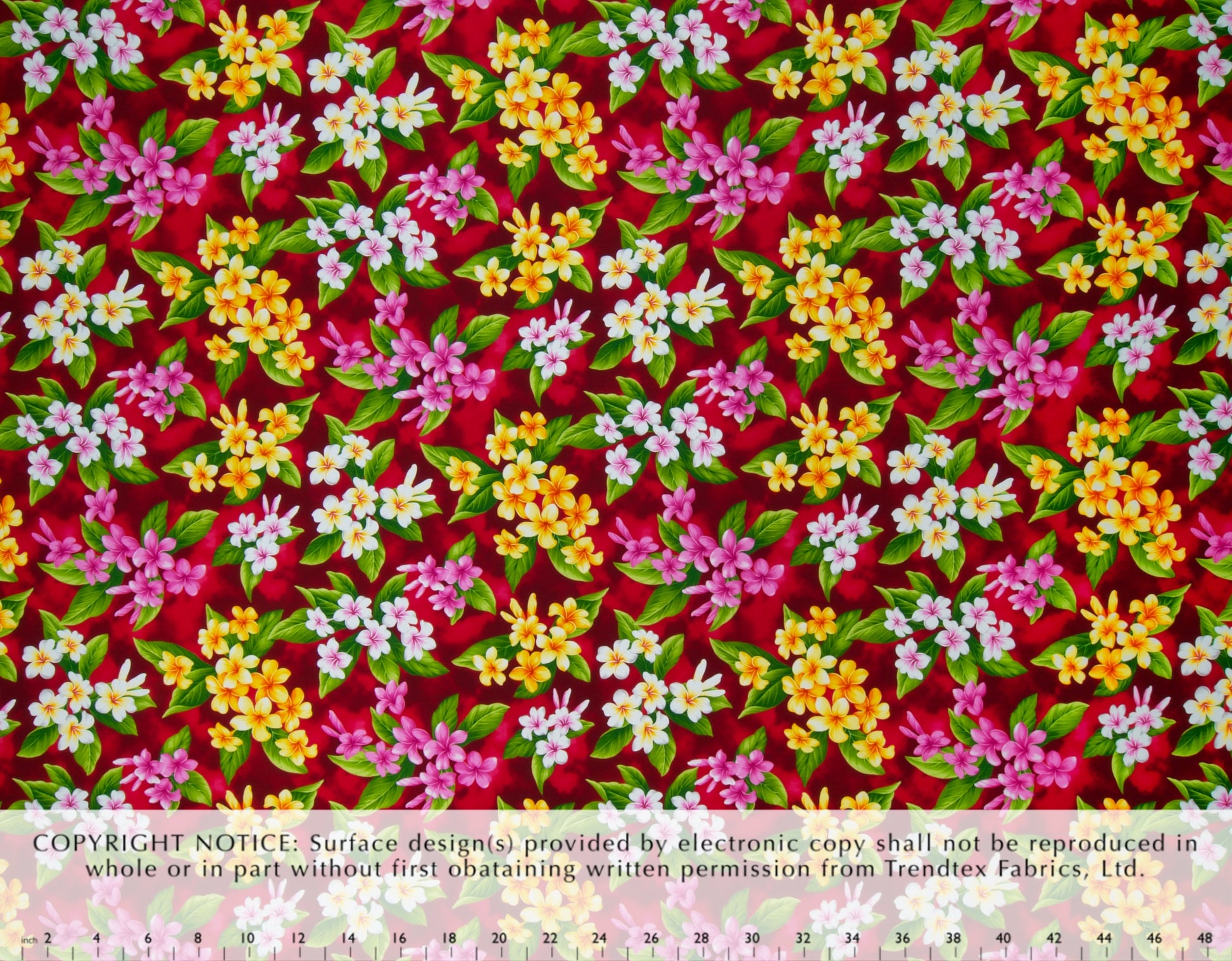 100% Cotton Poplin, 44/45"Wide, All-Over. Floral Pattern with Tropical Multi-Colored Plumeria Flowers on an Airbrushed Background.