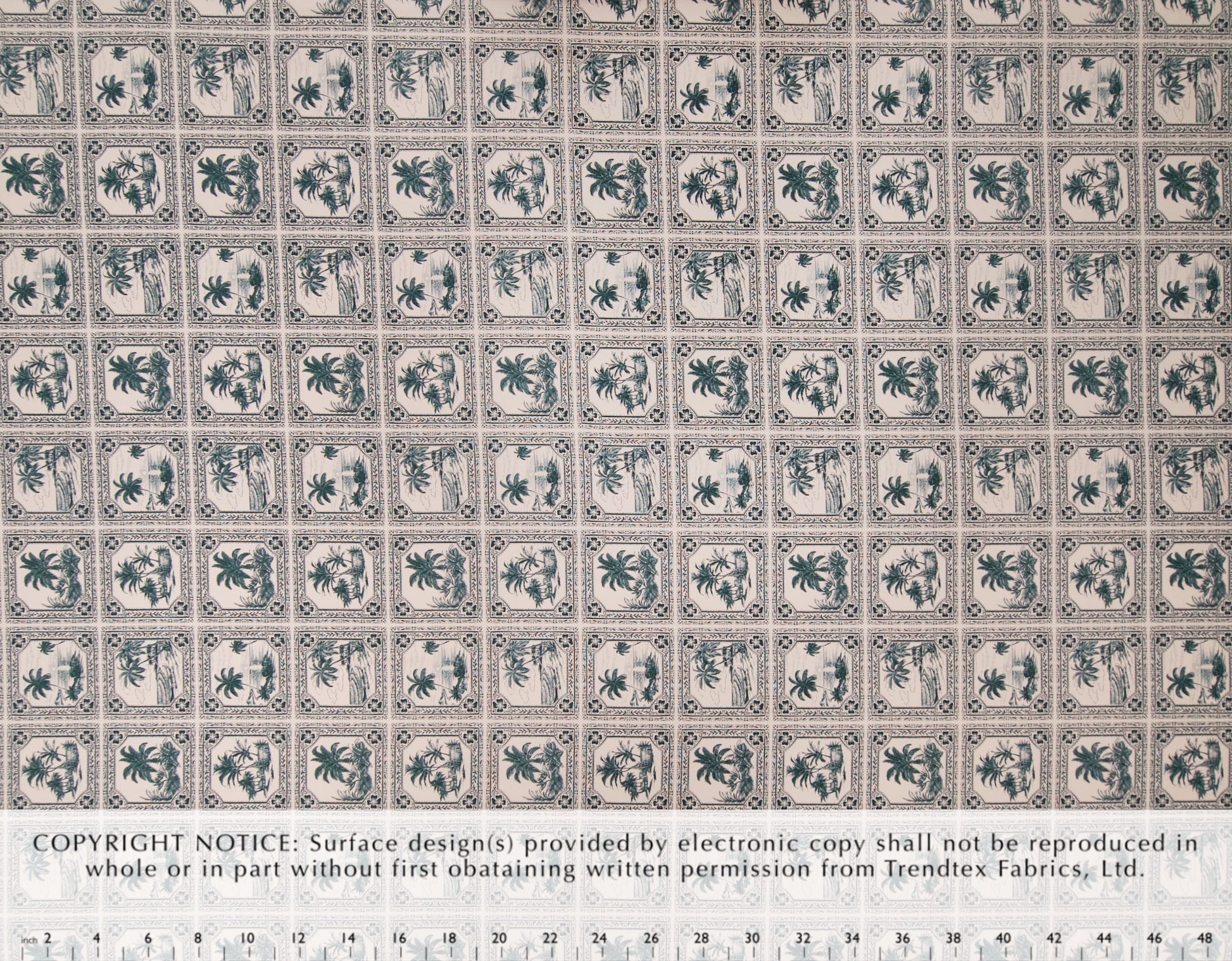 100% Cotton Poplin, 44/45"Wide, One-Way. Bandana Print Beach and Palm Tree Scenics.