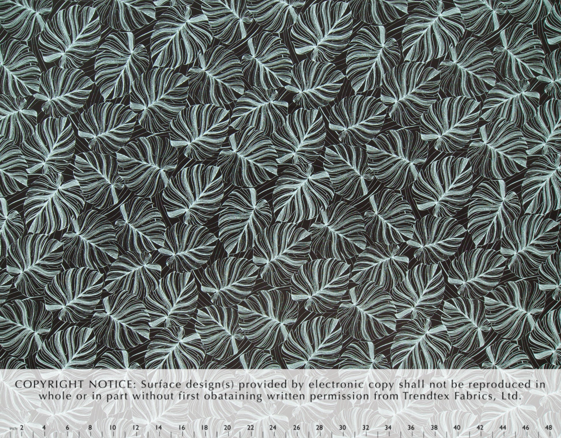 100% Rayon Poplin, 57" Wide, All-Over. Stylized Tropical Monstera Leaves.