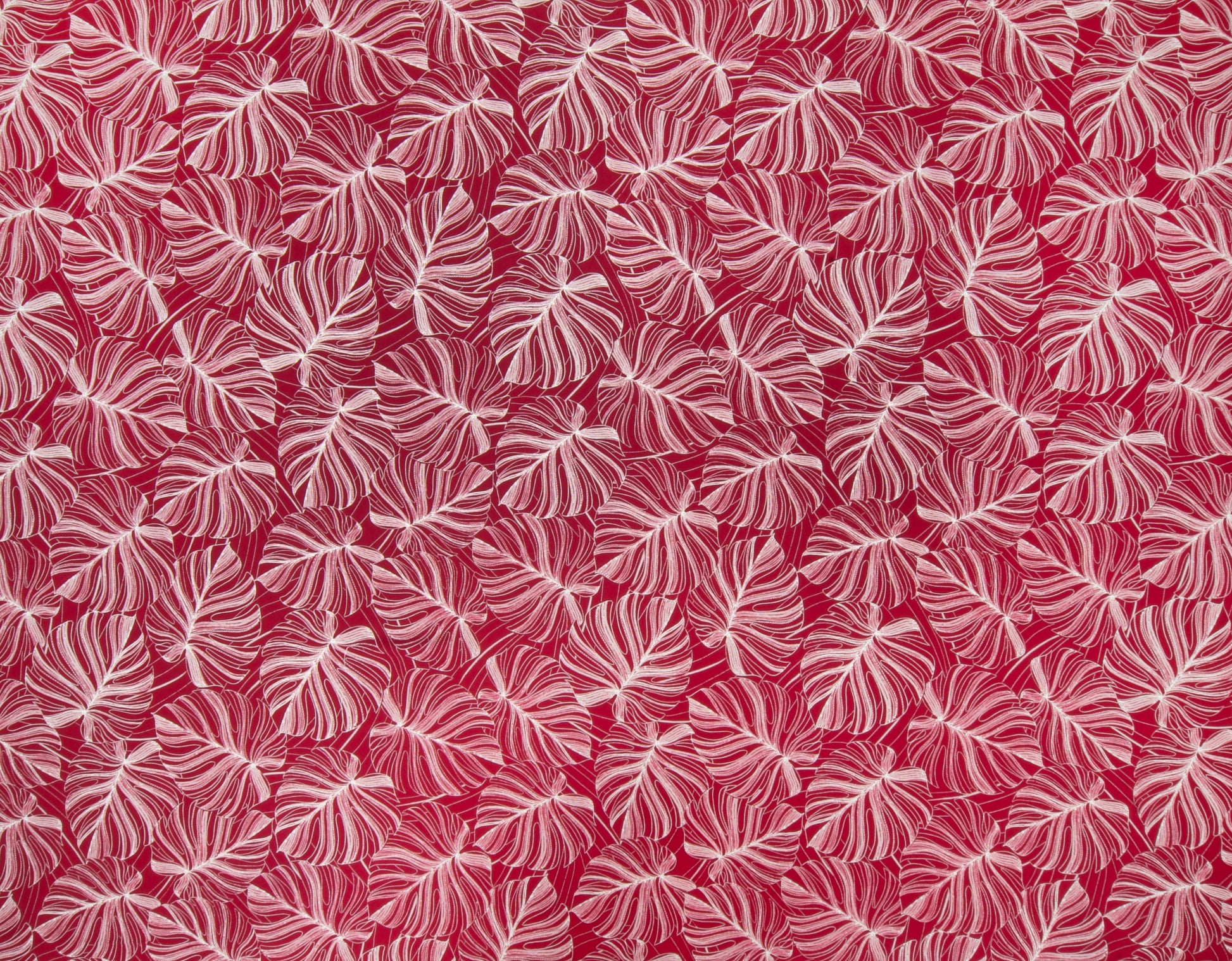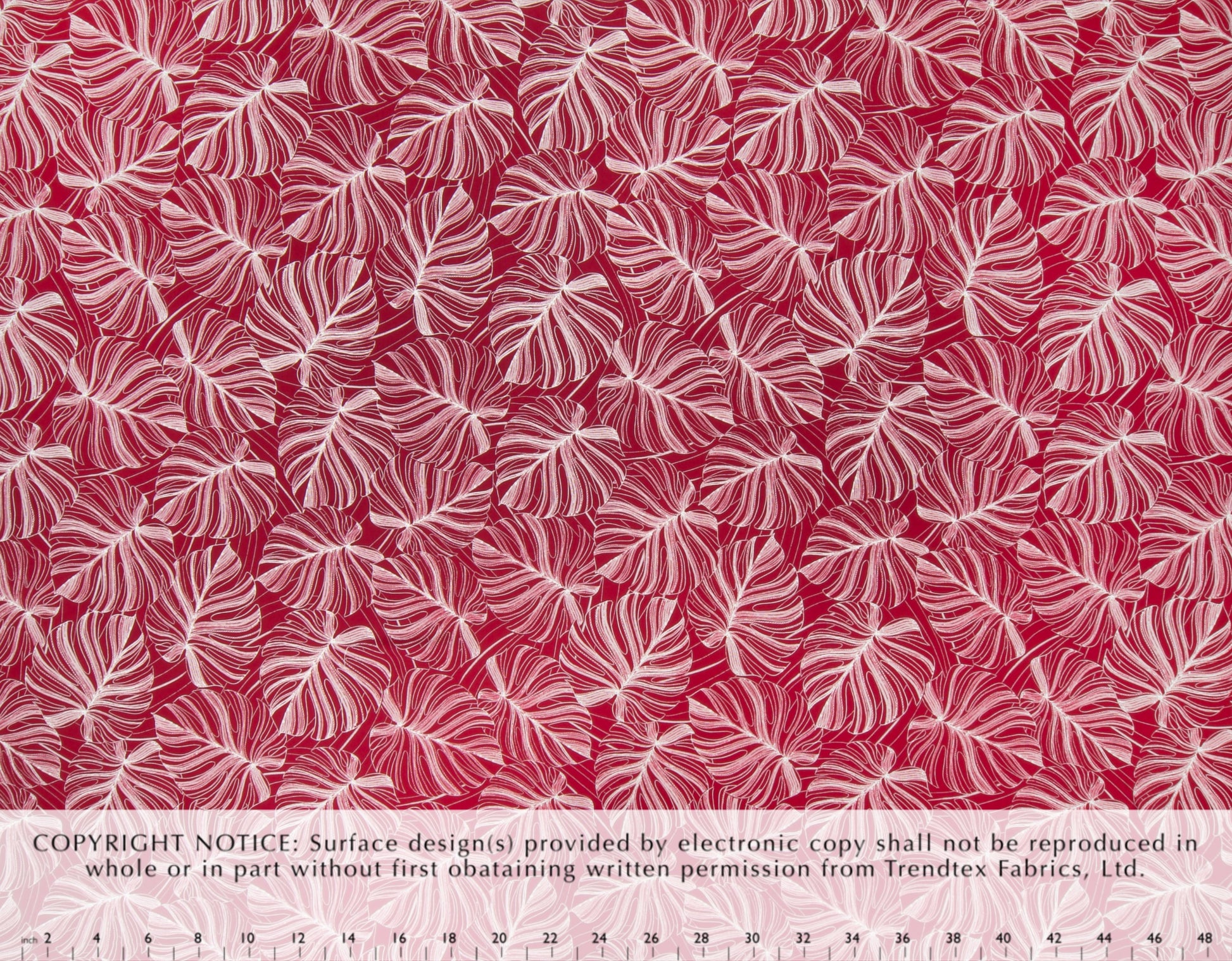 100% Rayon Poplin, 57" Wide, All-Over. Stylized Tropical Monstera Leaves.