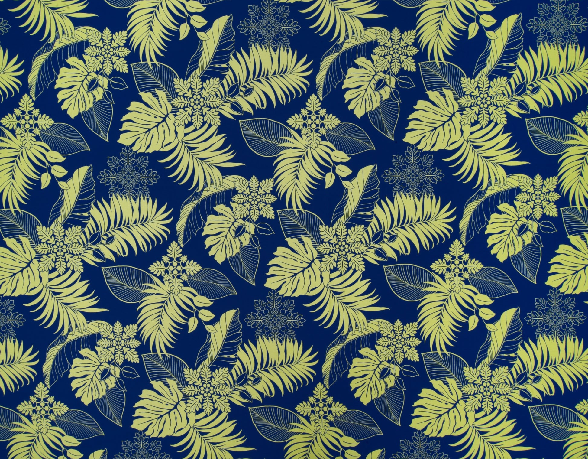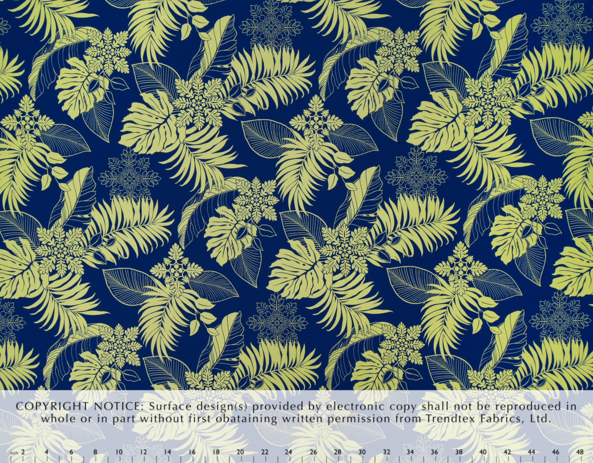 100% Cotton Poplin, 44/45"Wide, All-Over. Hawaiian Quilting Motifs Clustered with Tropical Leaves.