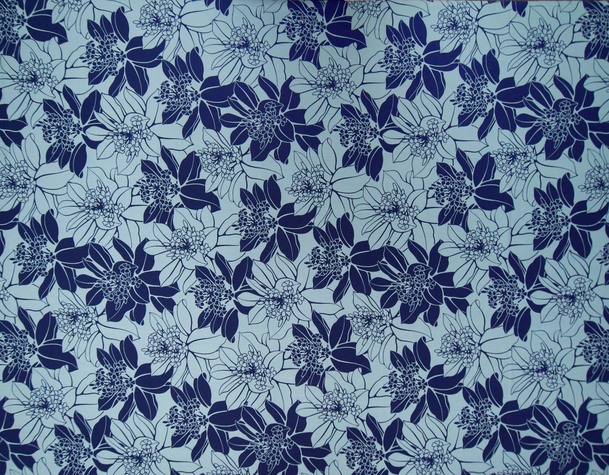 100% Cotton Poplin, 44/45"Wide, All-Over. Stylized Graphic Puakenikeni Flowers.