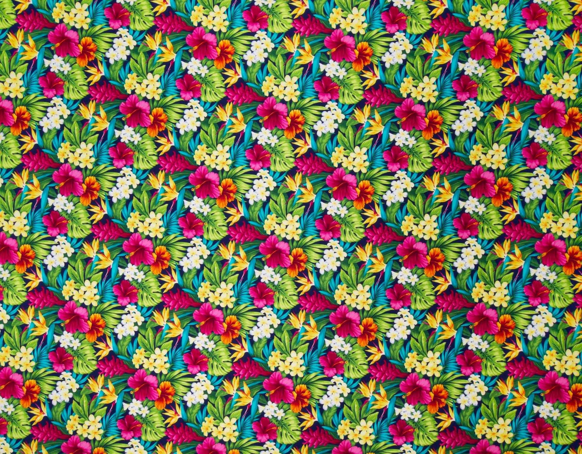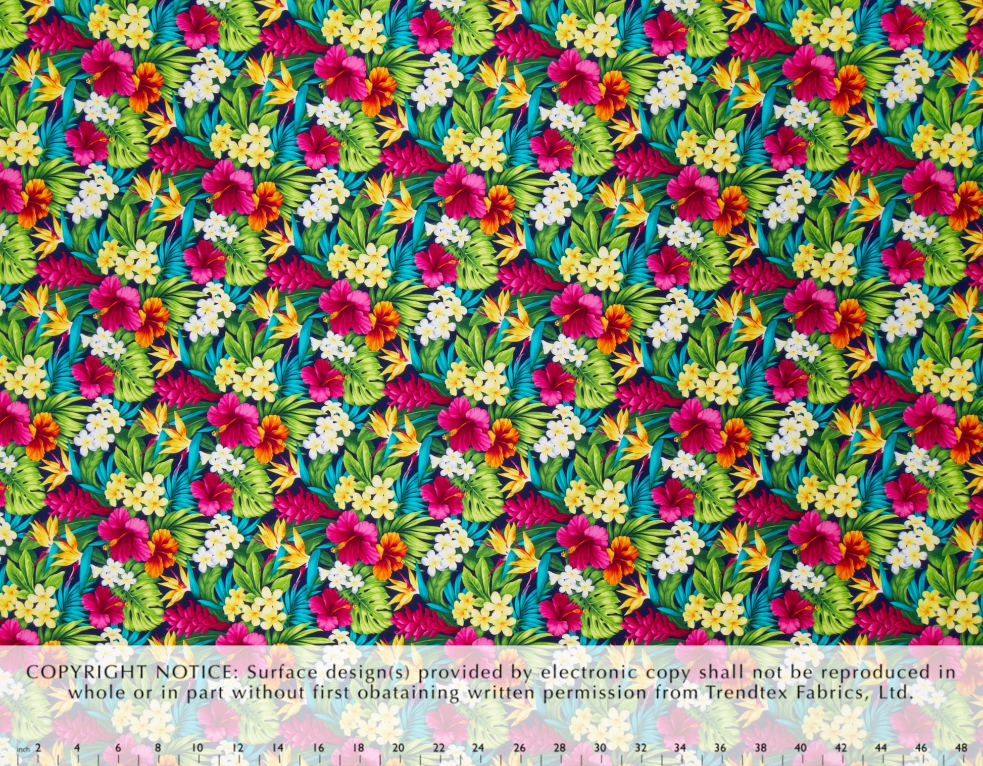 100% Cotton Manoa, 44/45"Wide, One- Way. Torch Ginger, Bird of Paradise, Hibiscus, and Plumeria Flowers with Tropical Leaves.