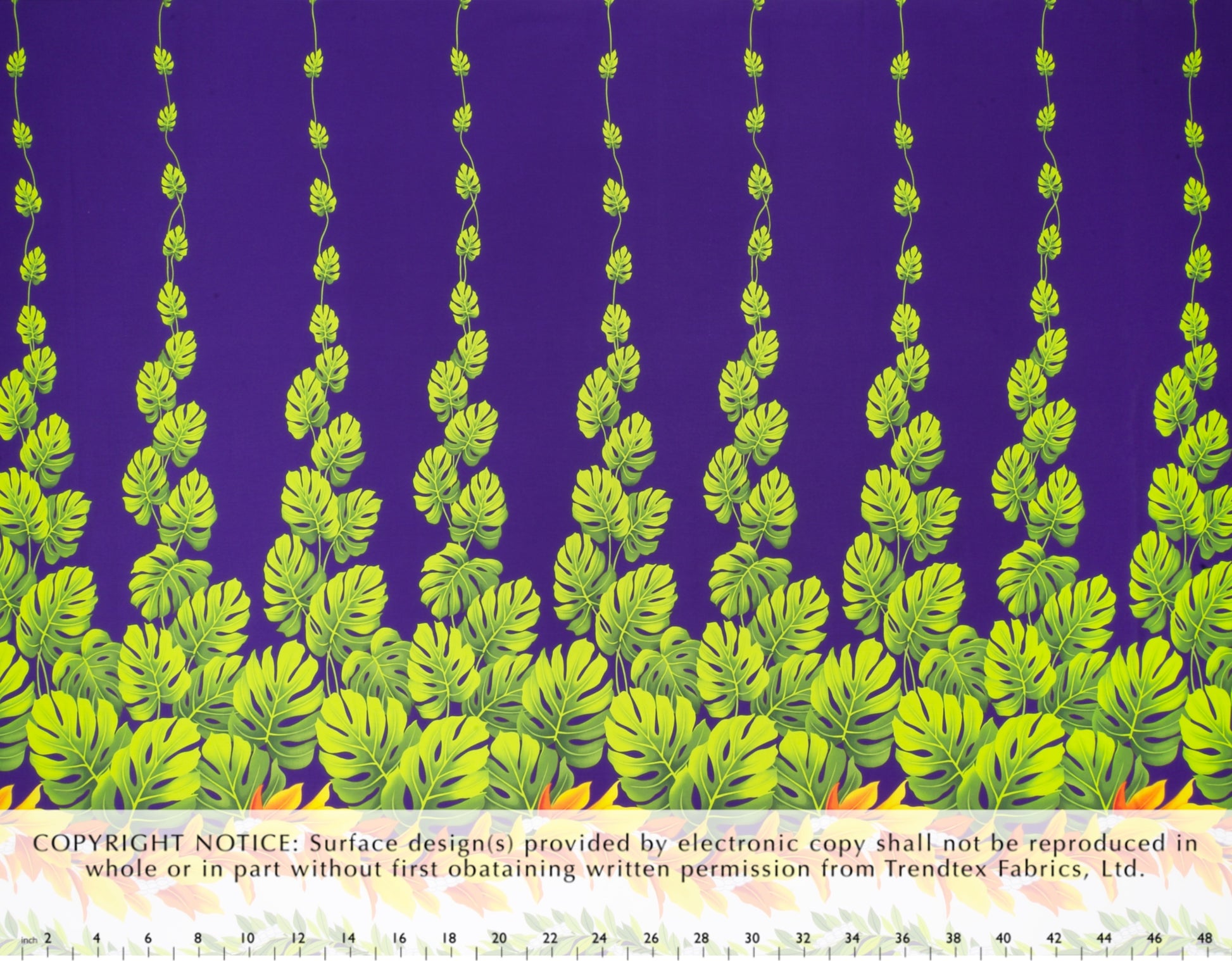 65% Polyester/35% Cotton Poplin, 44/45" Wide, Border. Tropical Monstera Leaves with Lei Border.