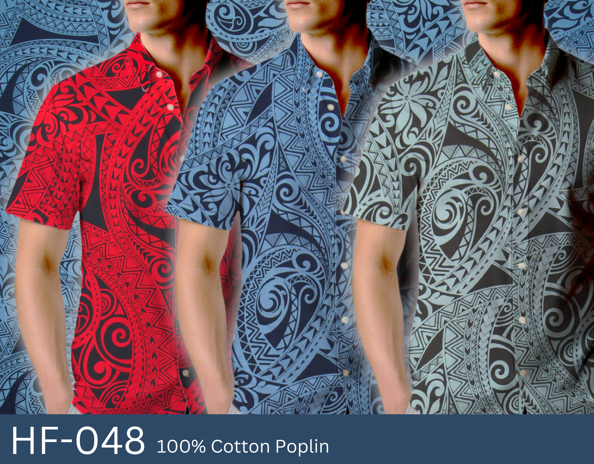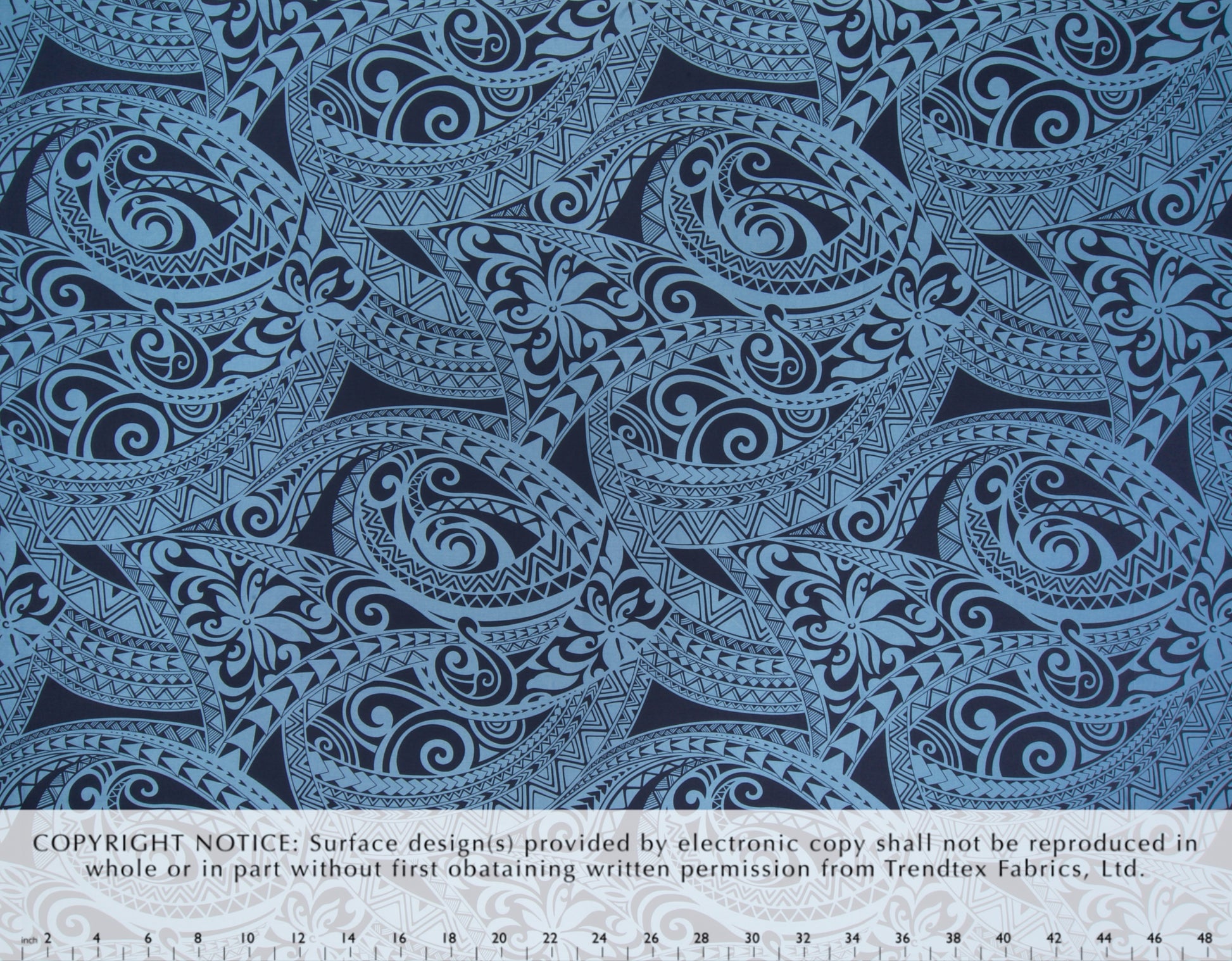 100% Cotton Poplin, 44/45"Wide, All-Over. Stylized Tapa Patterns with Tropical Tiare Flowers.