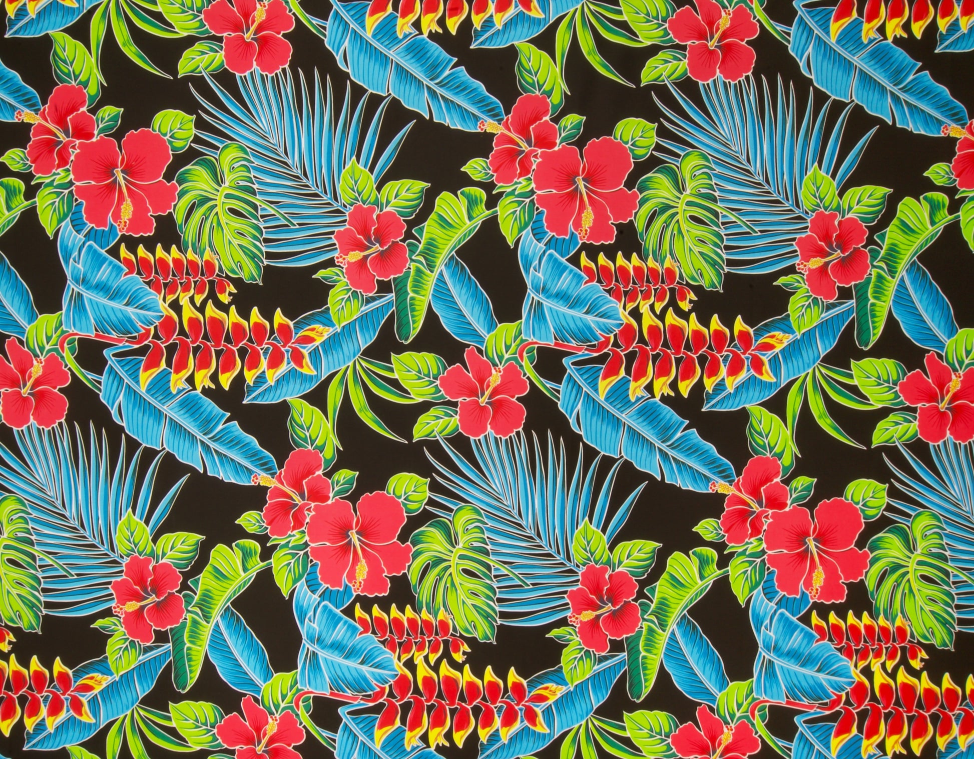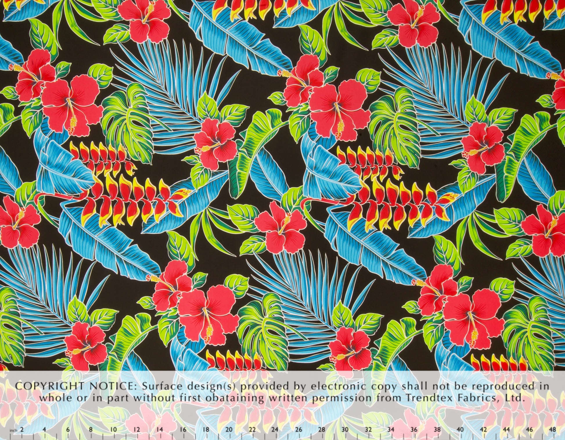 65% Polyester/35% Cotton Poplin, 44/45" Wide, One-Way. Bold Outlined Hibiscus and Heliconia Flowers Clustered with a Variety of Tropical Leaves.