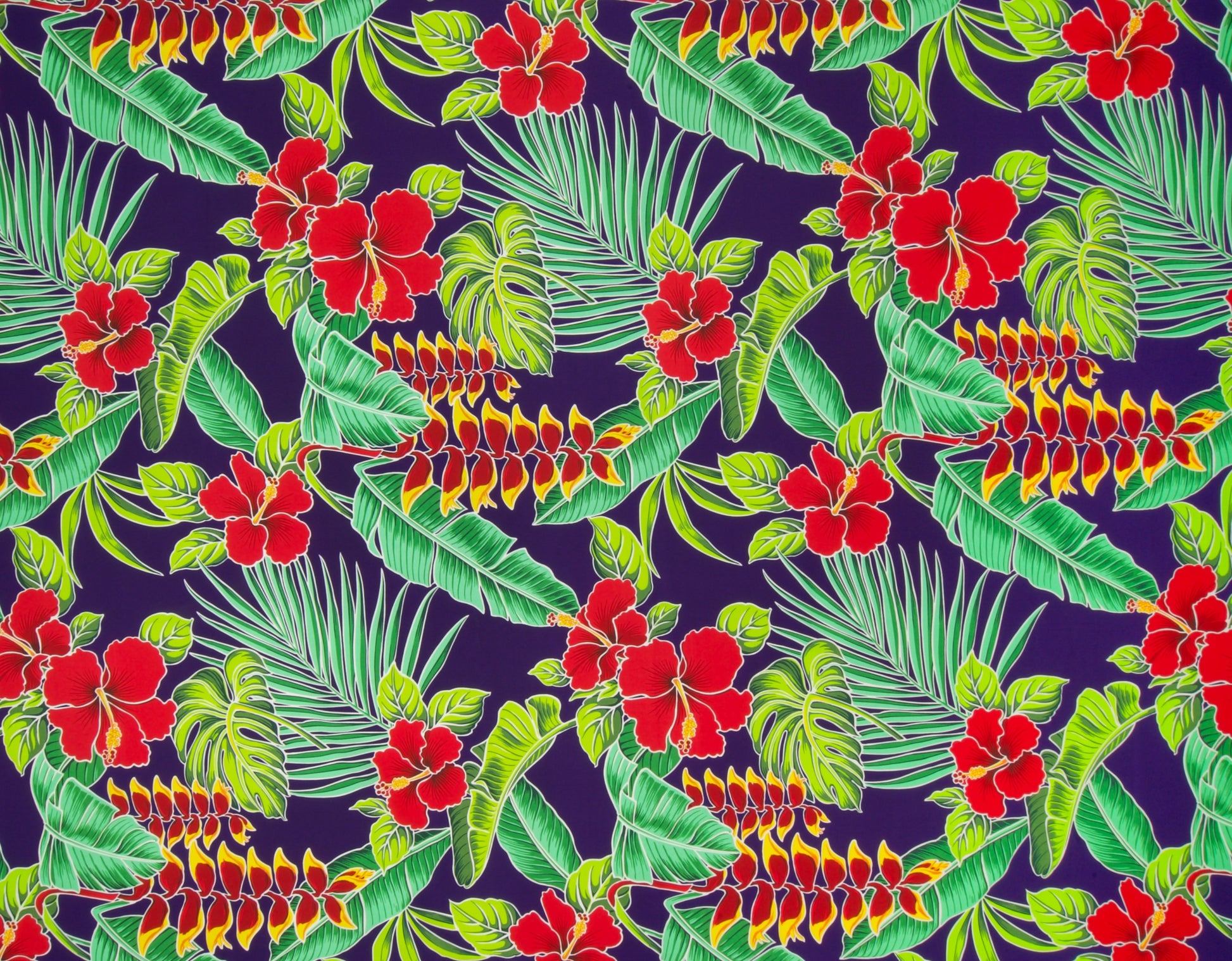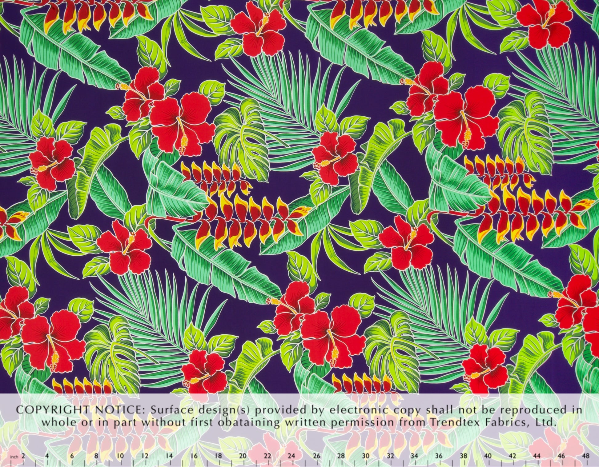 65% Polyester/35% Cotton Poplin, 44/45" Wide, One-Way. Bold Outlined Hibiscus and Heliconia Flowers Clustered with a Variety of Tropical Leaves.