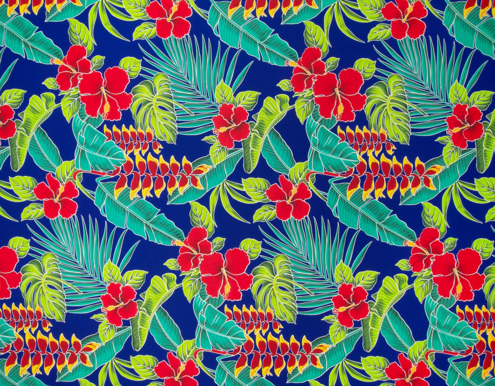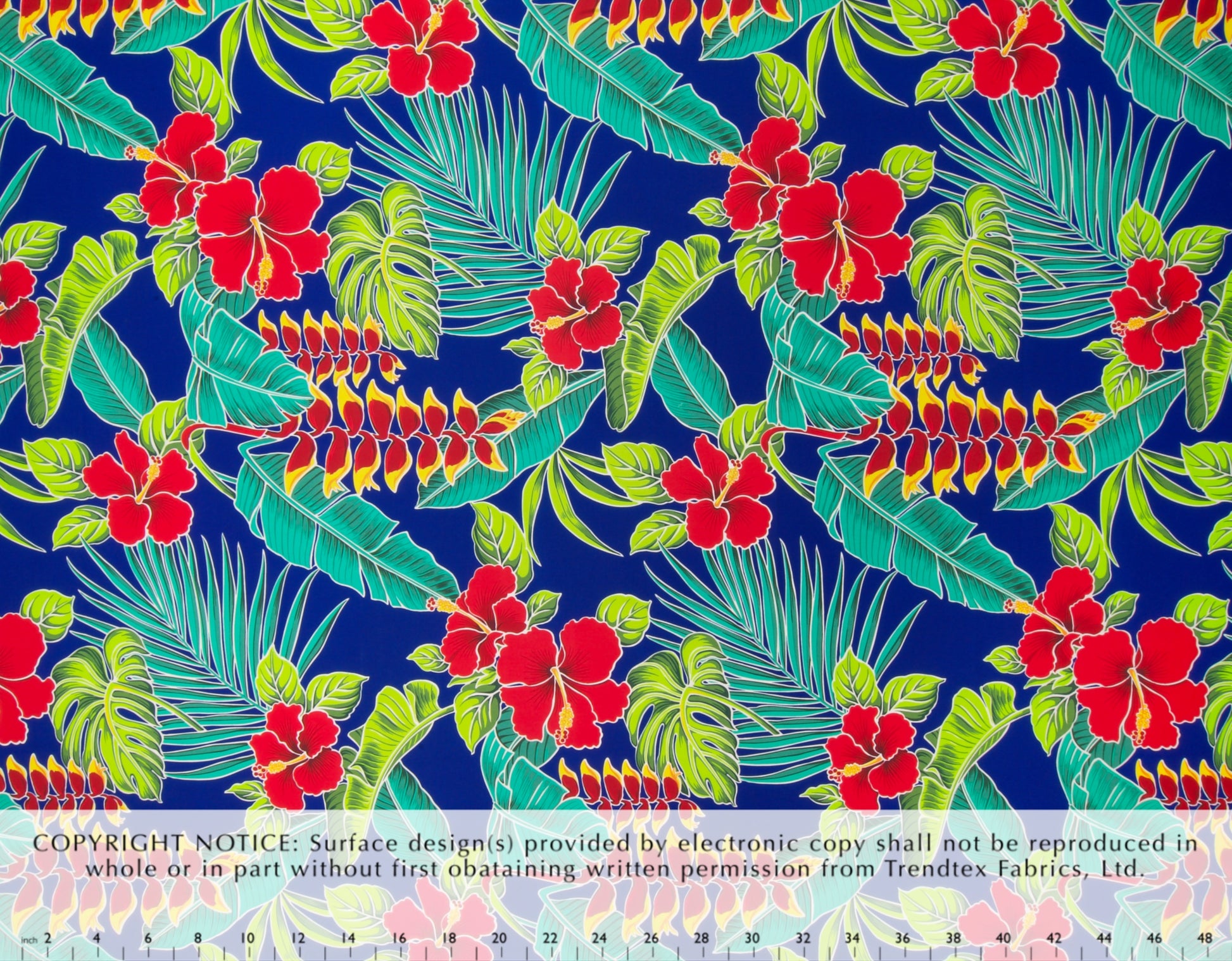 65% Polyester/35% Cotton Poplin, 44/45" Wide, One-Way. Bold Outlined Hibiscus and Heliconia Flowers Clustered with a Variety of Tropical Leaves.
