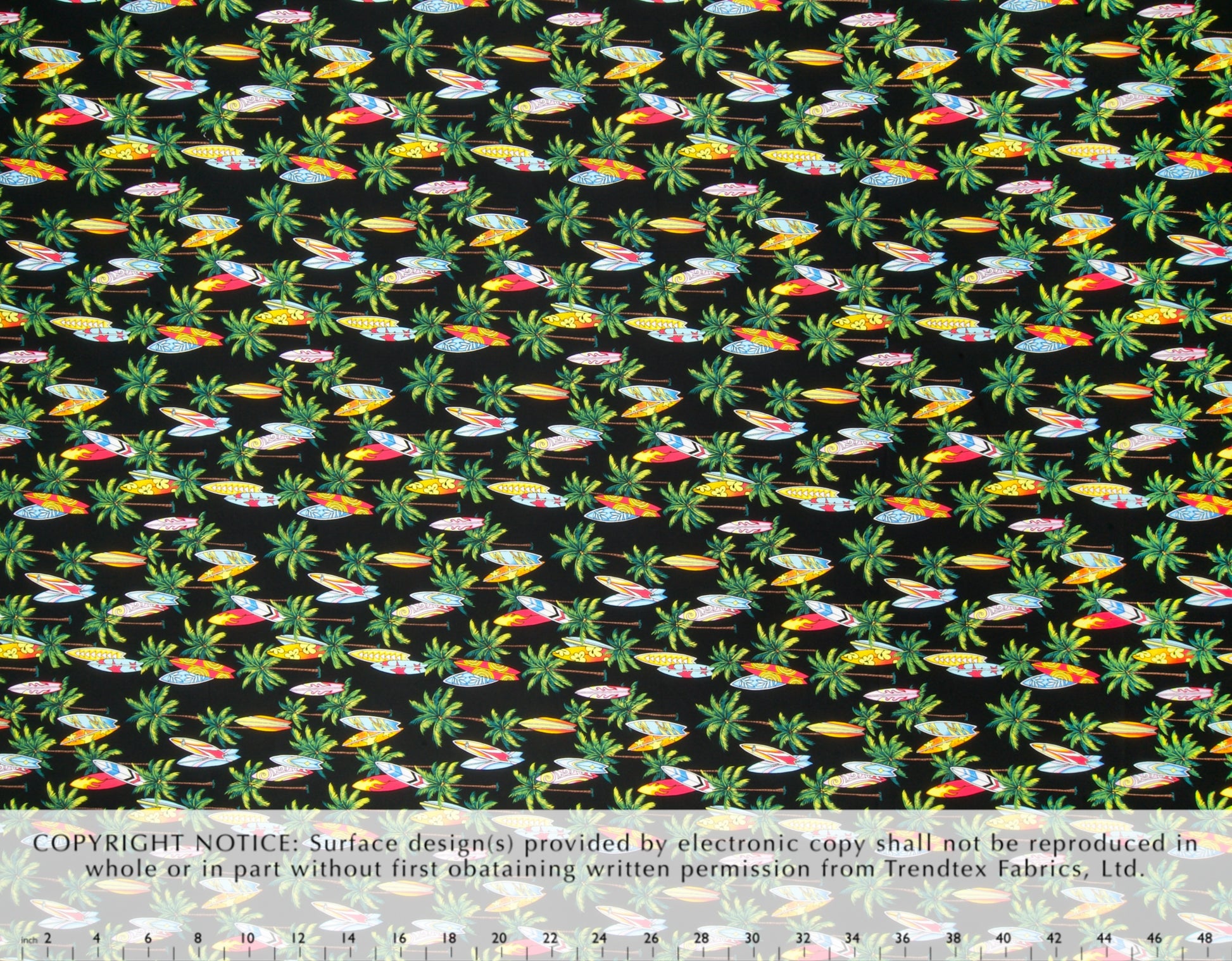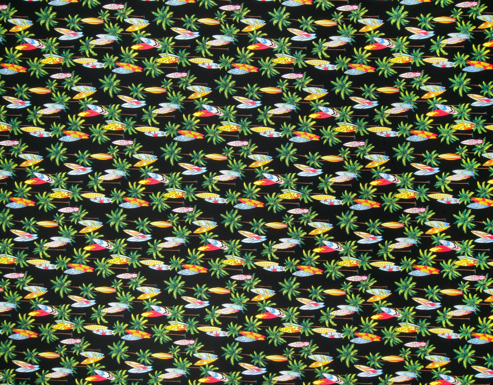 100% Cotton Manoa, 44/45"Wide, All-Over. Stylized Surfboards and Tropical Palm Trees.