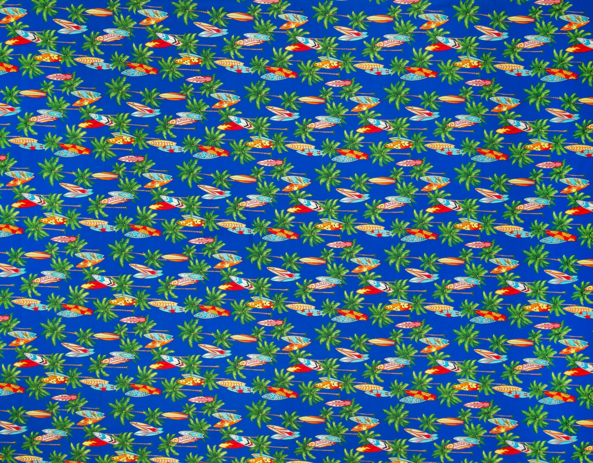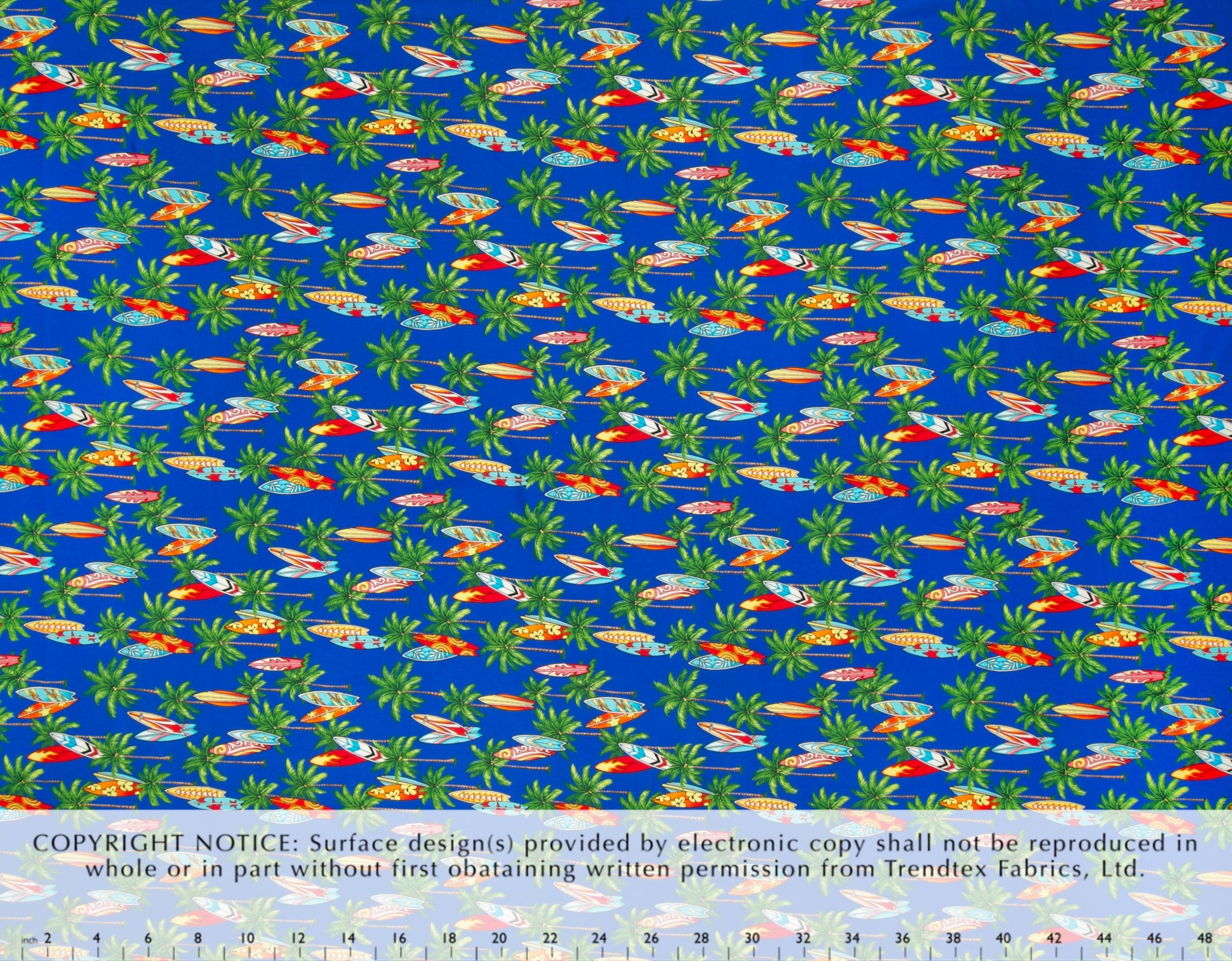 100% Cotton Manoa, 44/45"Wide, All-Over. Stylized Surfboards and Tropical Palm Trees.