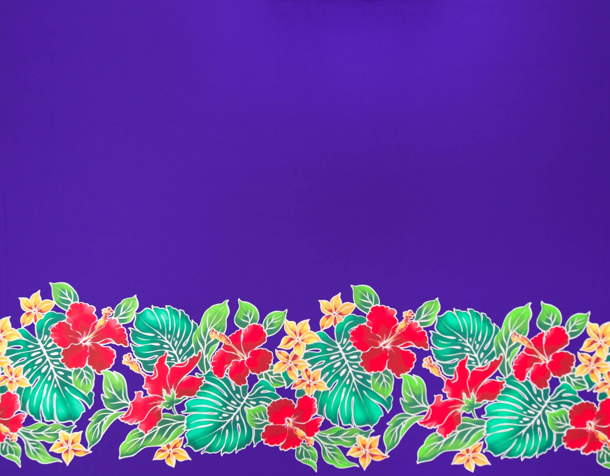 65% Polyester/35% Cotton Poplin, 44/45" Wide, Border Print. A Border of Hibiscus and Plumeria Flowers with Monstera Leaves.