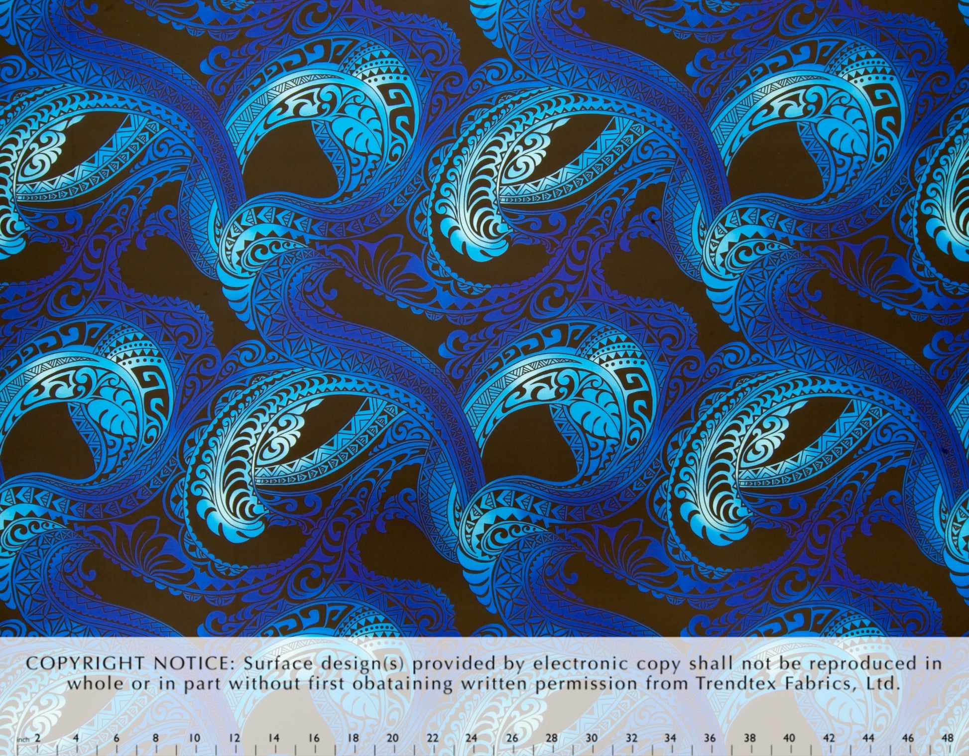 65% Polyester/35% Cotton Poplin, 44/45" Wide, All-Over. Swirling Tribal Tattoo Design on a Solid Background.