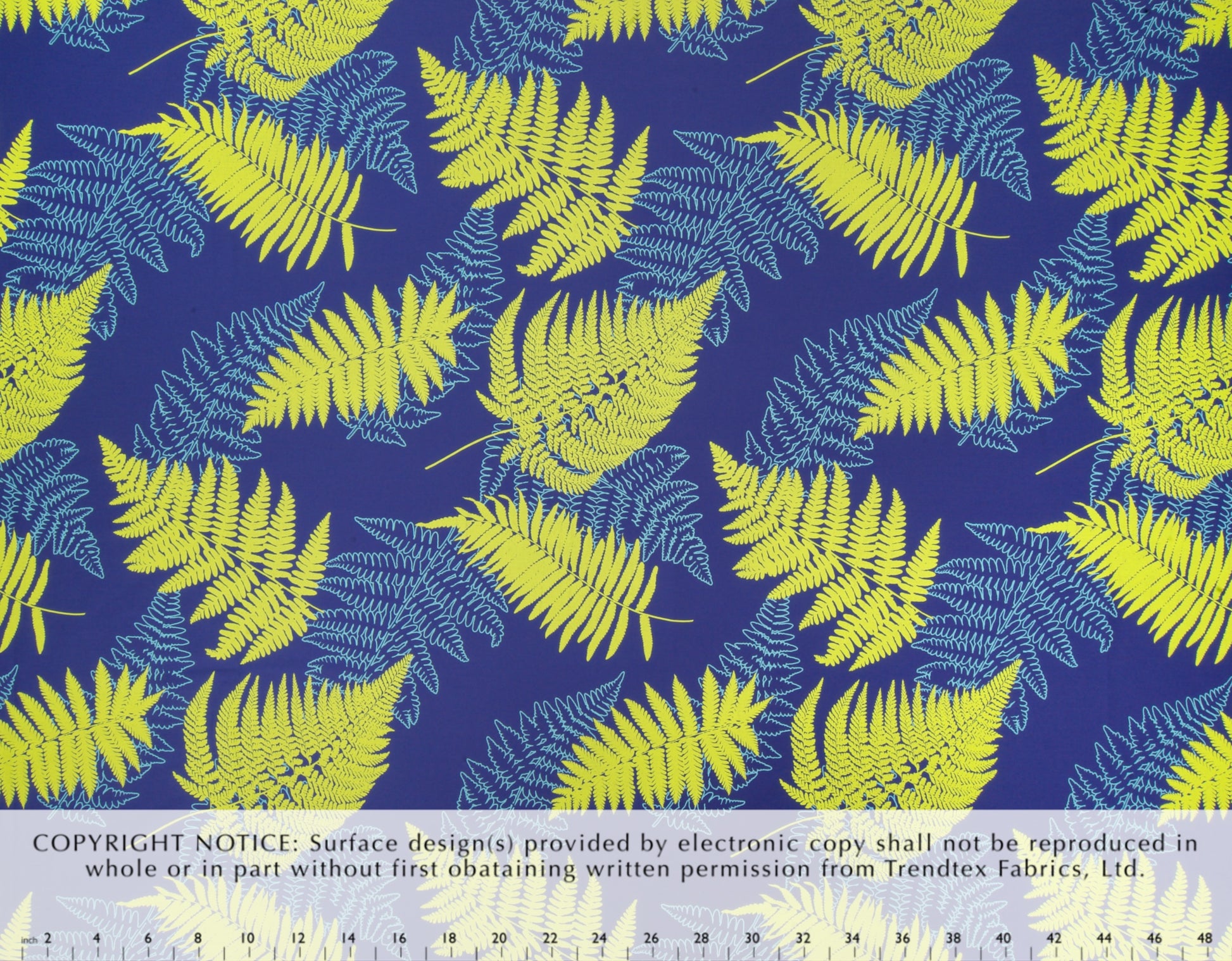 65% Polyester/35% Cotton Poplin, 44/45" Wide, All-Over. Fern Leaves on a Solid Background.